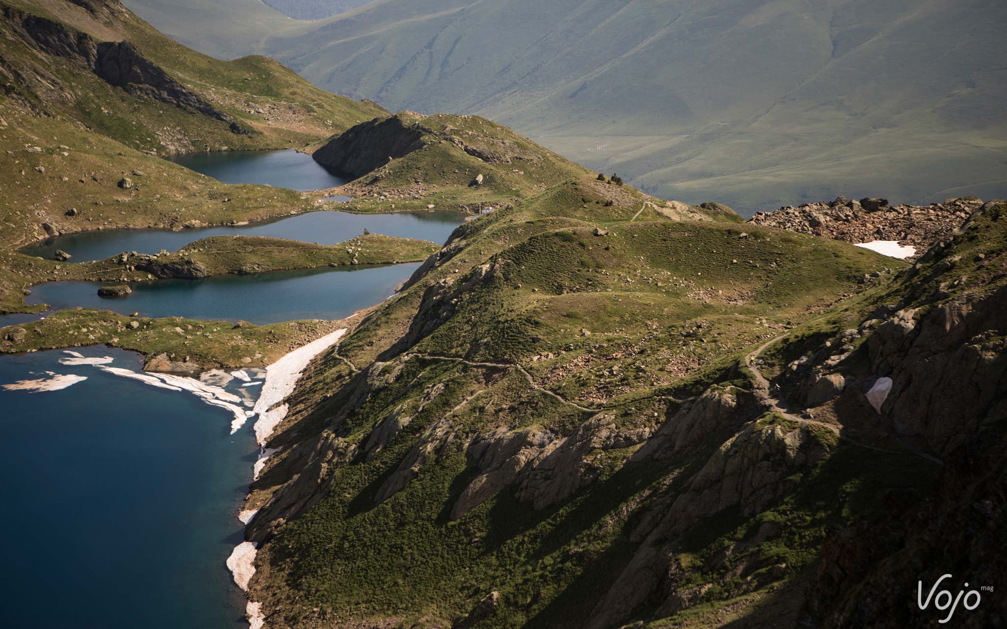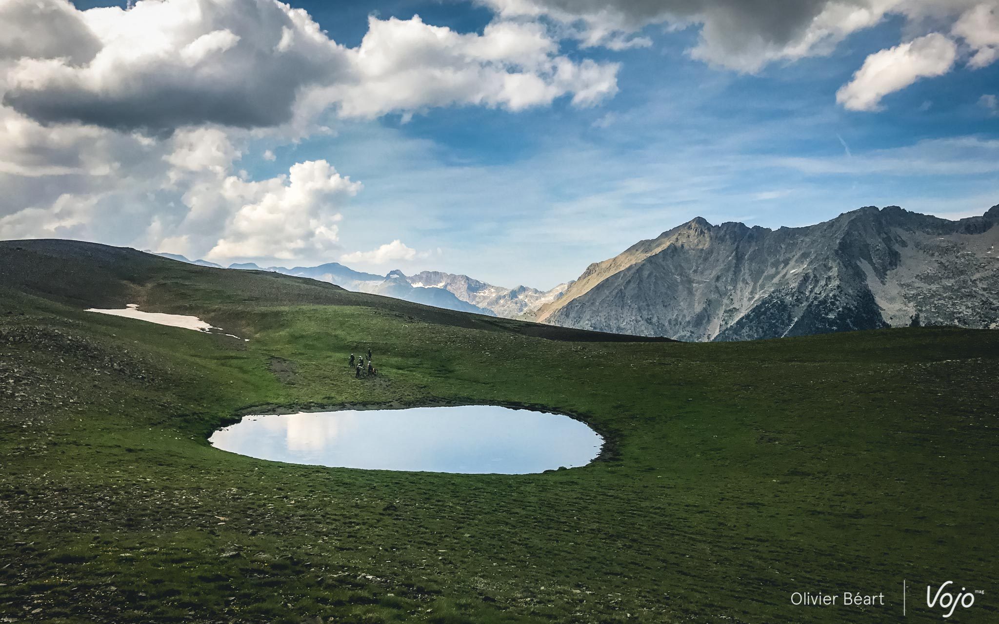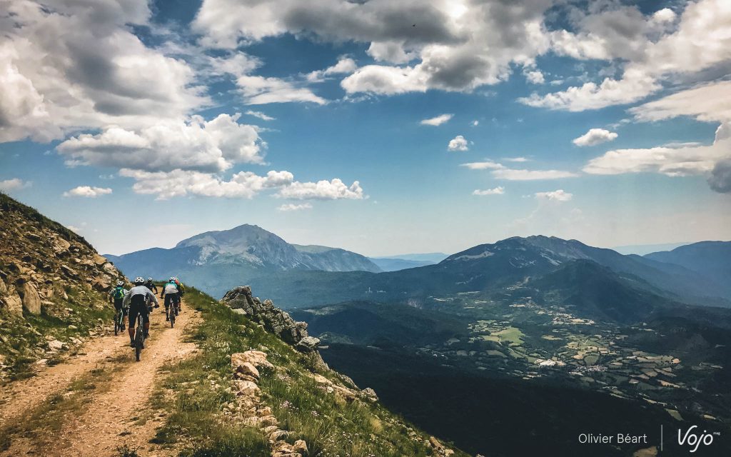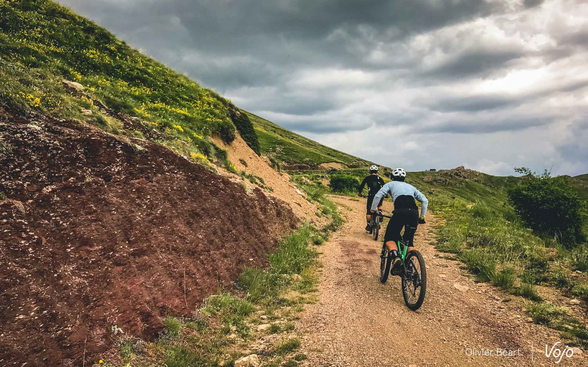 Près du sommet, nous devons encore porter le vélo sur quelques dizaines de mètres. L’occasion de voir que l’Orbea Rallon R5 carbone est particulièrement léger, avec à peine plus de 13kg pédales comprises. Et avec l’amortisseur à ressort. Car oui, je ne vous l’ai pas dit mais j’ai laissé l’amortisseur à air au vestiaire pour tenter l’option plus « fat ». Je vais vite me rendre compte que c’est un très bon choix quand il s’agit de manger du dénivelé : nous avons 3800m de négatif au programme aujourd’hui !