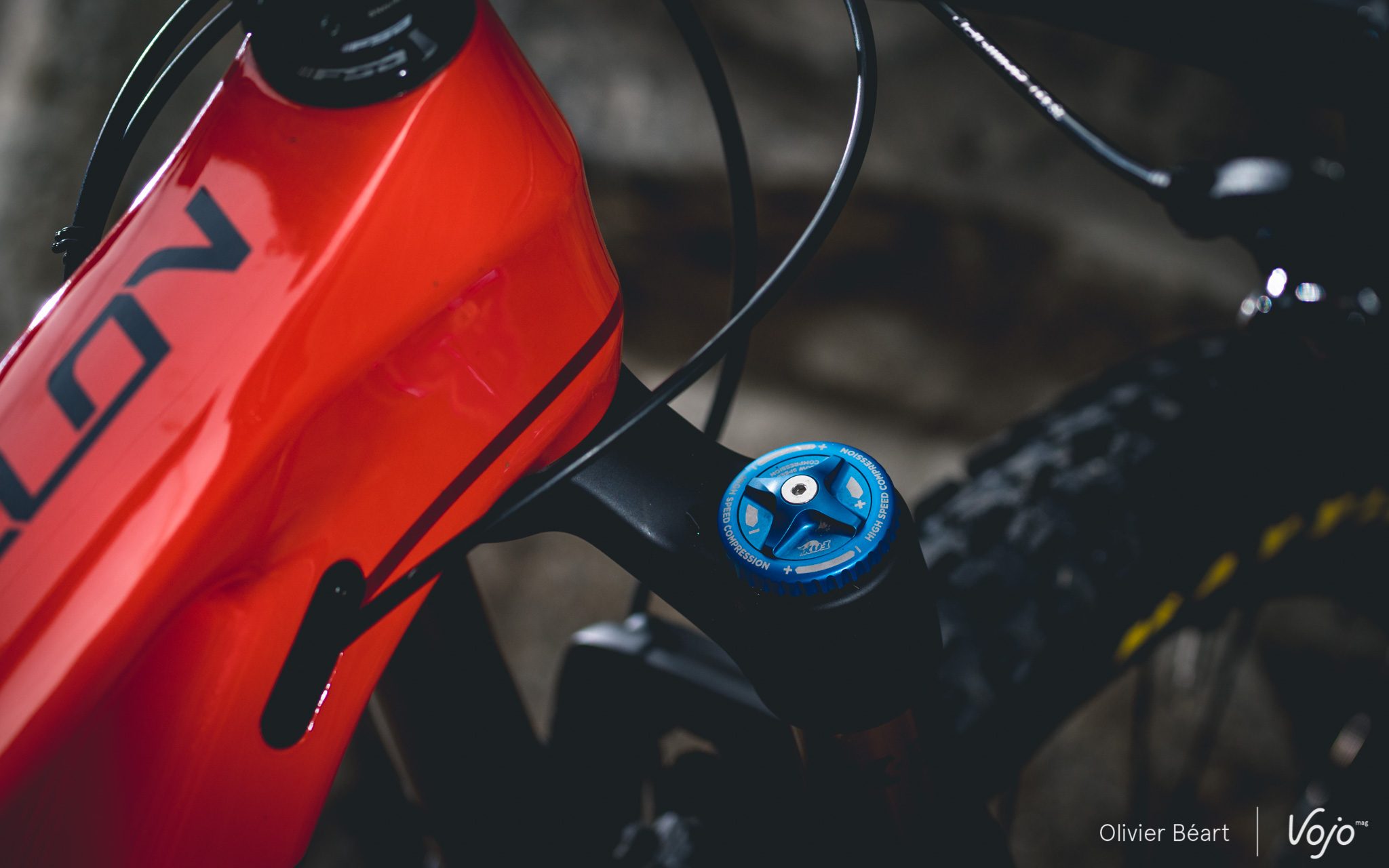 L’amortisseur arrière mérite qu’on s’y attarde, puisque l’Orbea Rallon R5 carbone est prévu pour être monté avec trois amortisseurs Fox : le nouveau DPX2 quand on privilégie la légèreté, le X2 Air pour avoir plus de possibilités de réglages et/ou qu’on habite dans des régions plus vallonnées, ainsi que le DHX2 Coil quand on aime le feeling du ressort acier. Pour notre part, nous l’avons testé avec les deux dernières options, en commençant par le X2 Air. Orbea insiste sur le fait que les réglages de chaque amortisseur ont été optimisés avec Fox afin que le caractère du Rallon reste intact et qu’un changement à ce niveau ne chamboule pas complètement le caractère de la machine même si la différence doit rester perceptible. Maintenant, voyons ce qu’il en est sur le terrain !