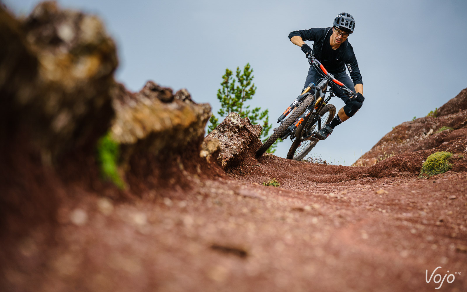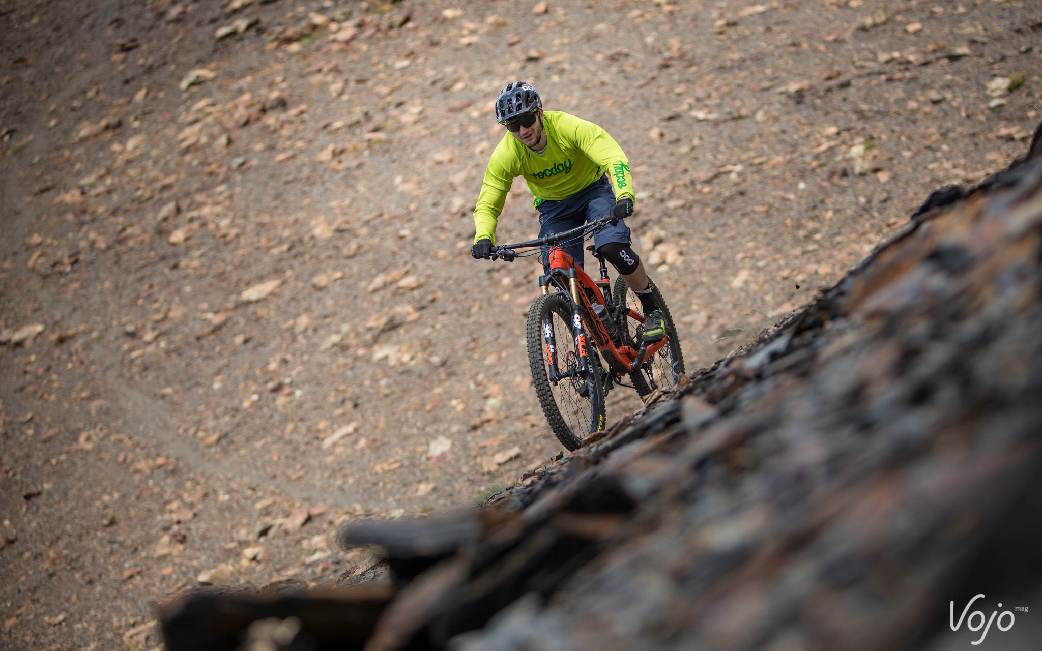 Lors de cette première journée, nous avons emmené l’Orbea Rallon R5 carbone sur des pistes particulièrement chaotiques avec des roches rouges abrasives et cassantes. Pas question de se louper car on sent qu’on risque de fameusement rayer la carrosserie. Pourtant, immédiatement, le Rallon me met en confiance. Je commence en y allant mollo, avec toujours dans un petit coin de ma tête l’idée que la roue risque de rester coincée entre deux de ces milliers de rochers ou qu’elle va buter contre une arrête. Mais en fait non.