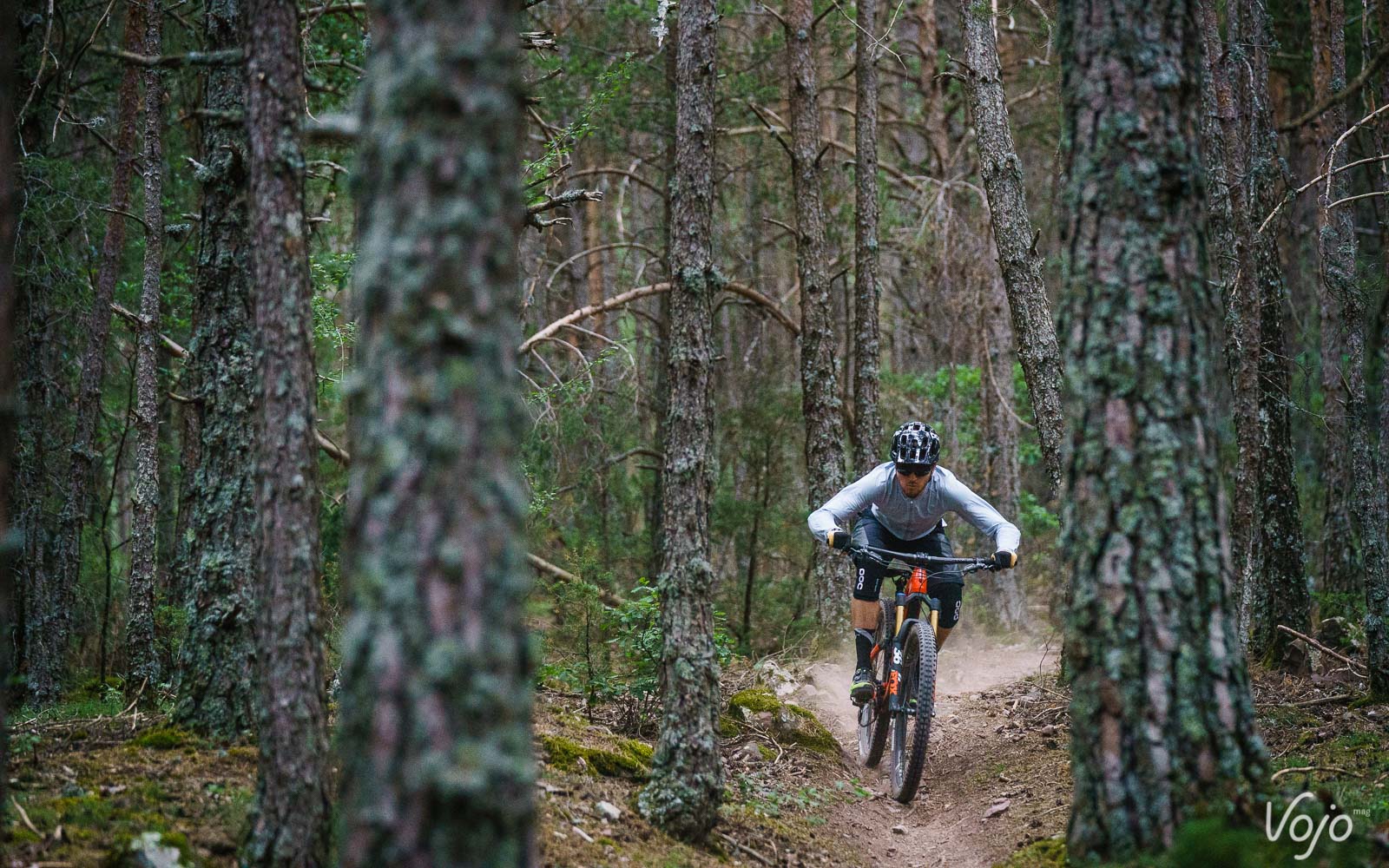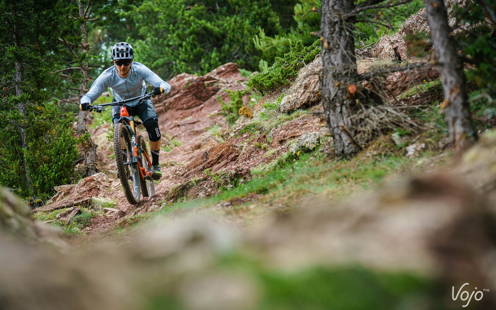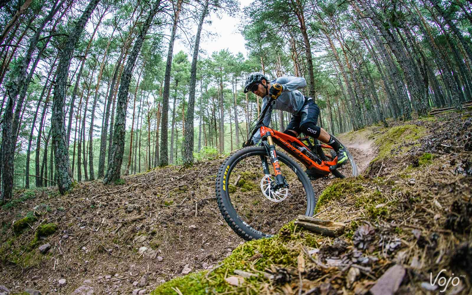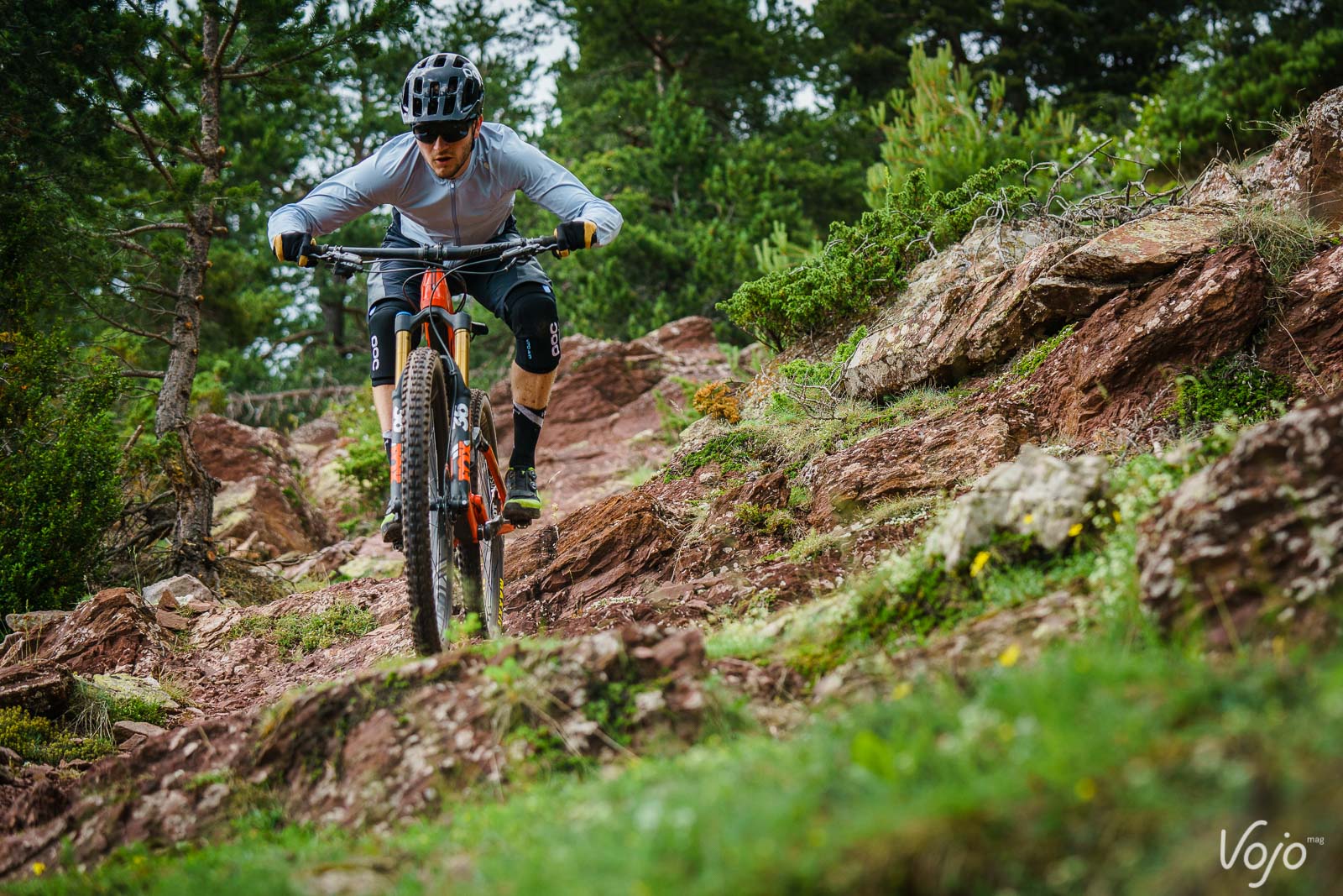 On constate vite que c’est aussi un franchisseur hors pair, même avec l’amortisseur placé dans la position « Lower » qui met le boîtier de pédalier à seulement 336mm du sol. Mais il est temps maintenant de l’emmener là où il doit performer : de vraies spéciales d’enduro et des descentes marathon !