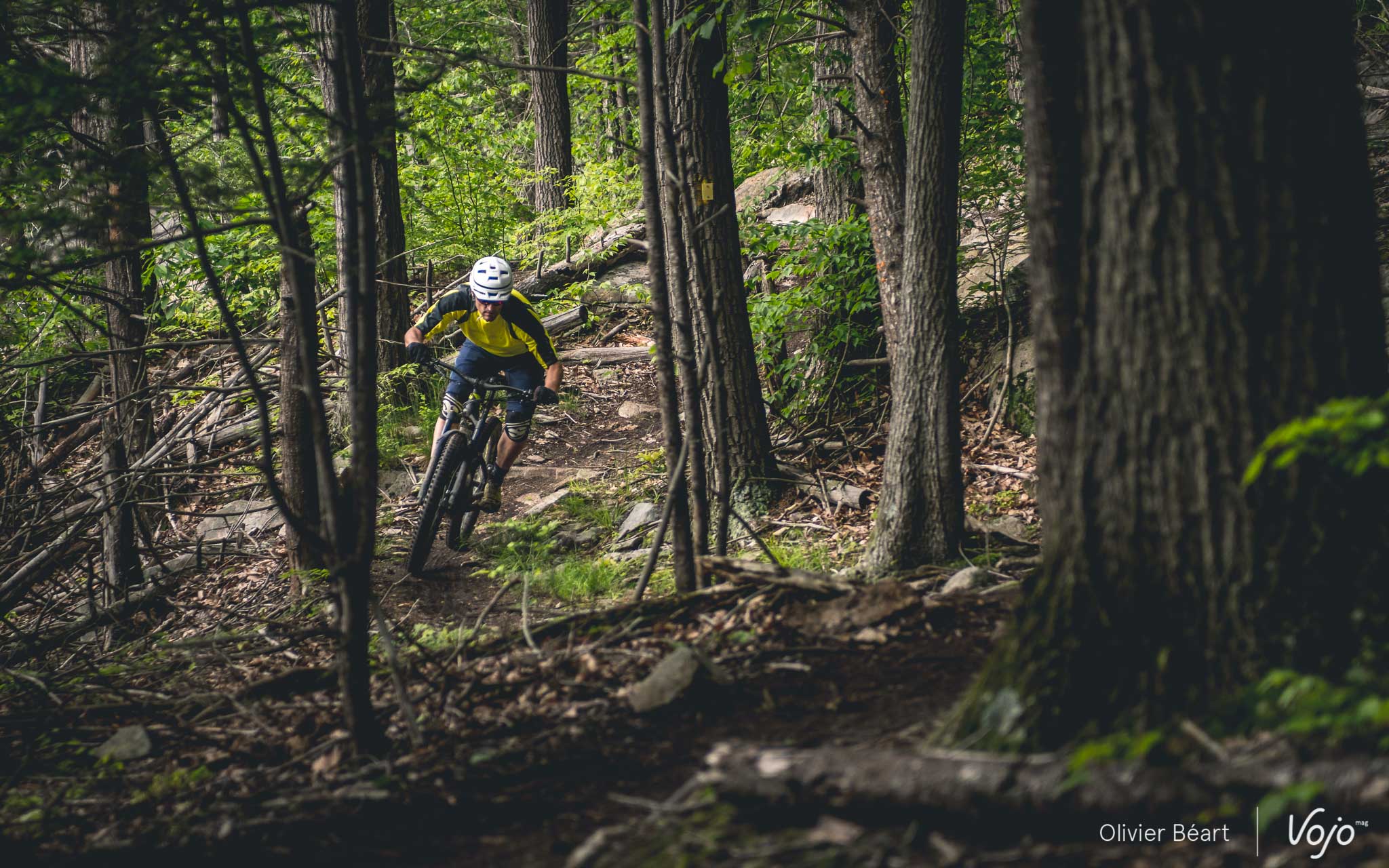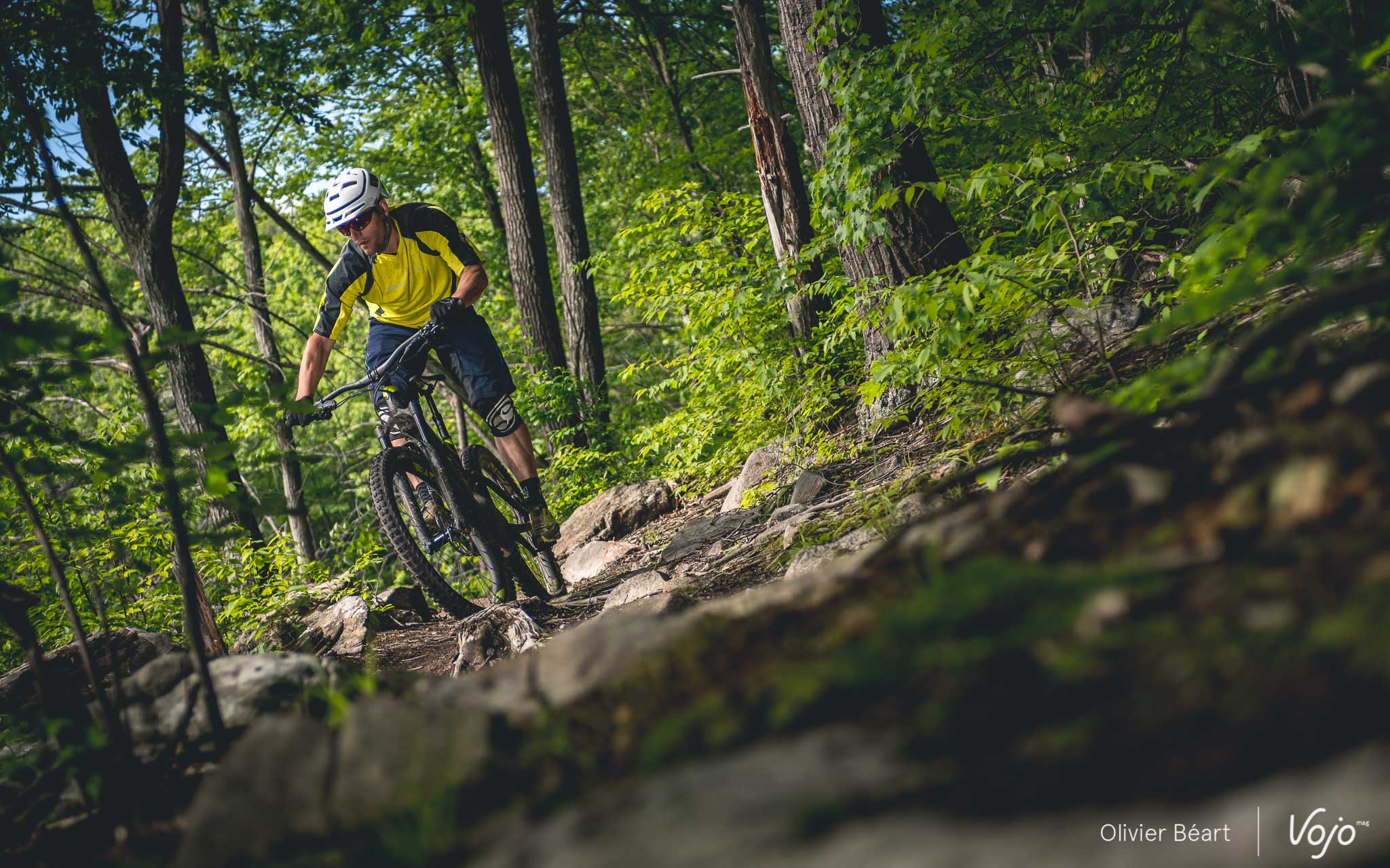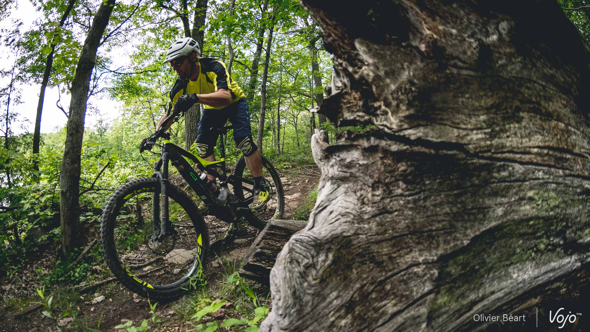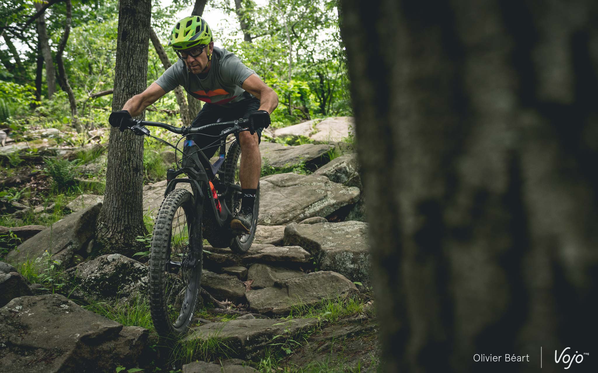 Pour cette première sortie, la découverte se fait en groupe. On se met en route et on grimpe jusqu’au sommet des pistes de la petite station de Mountain View, bien entendu sans prendre les remontées mécaniques. Je retrouve avec plaisir la discrétion et la souplesse caractéristiques du Levo. C’est toujours plus subtil qu’un Bosch, même avec la mise à jour e-MTB qui améliore pourtant les choses. Et le Shimano n’arrive pas non plus au même raffinement selon moi, d’autant que la coupure moteur du Levo est plus progressive encore avec ce nouveau moteur et la dernière gestion.