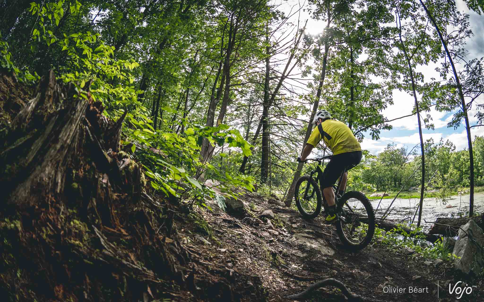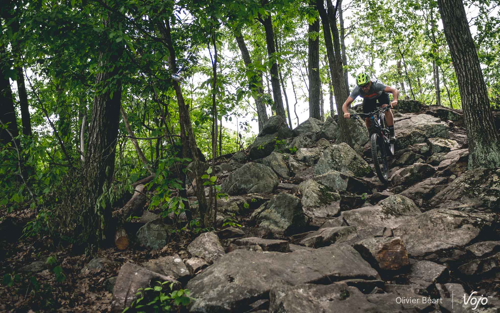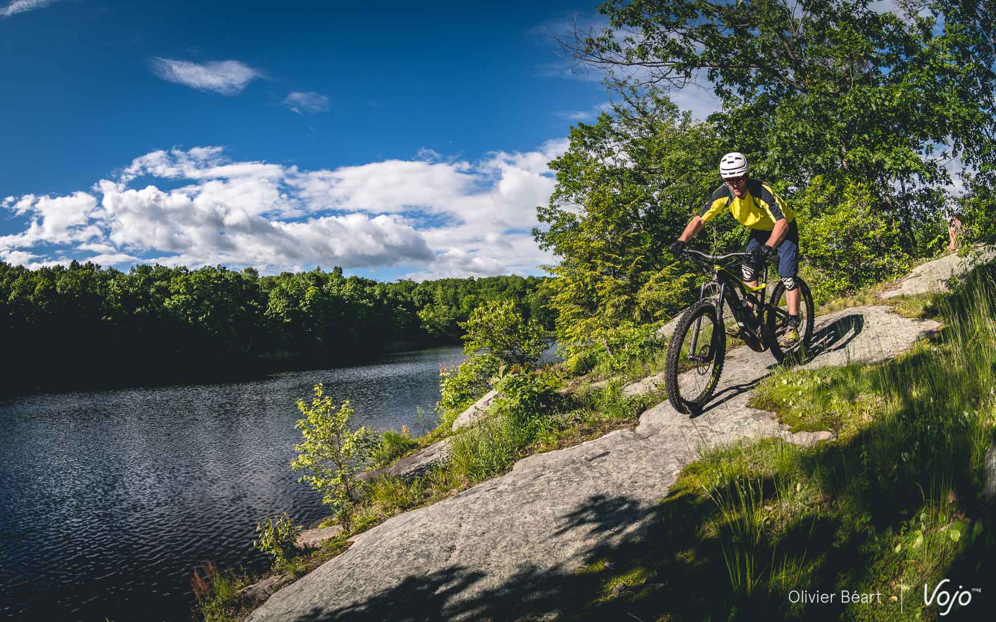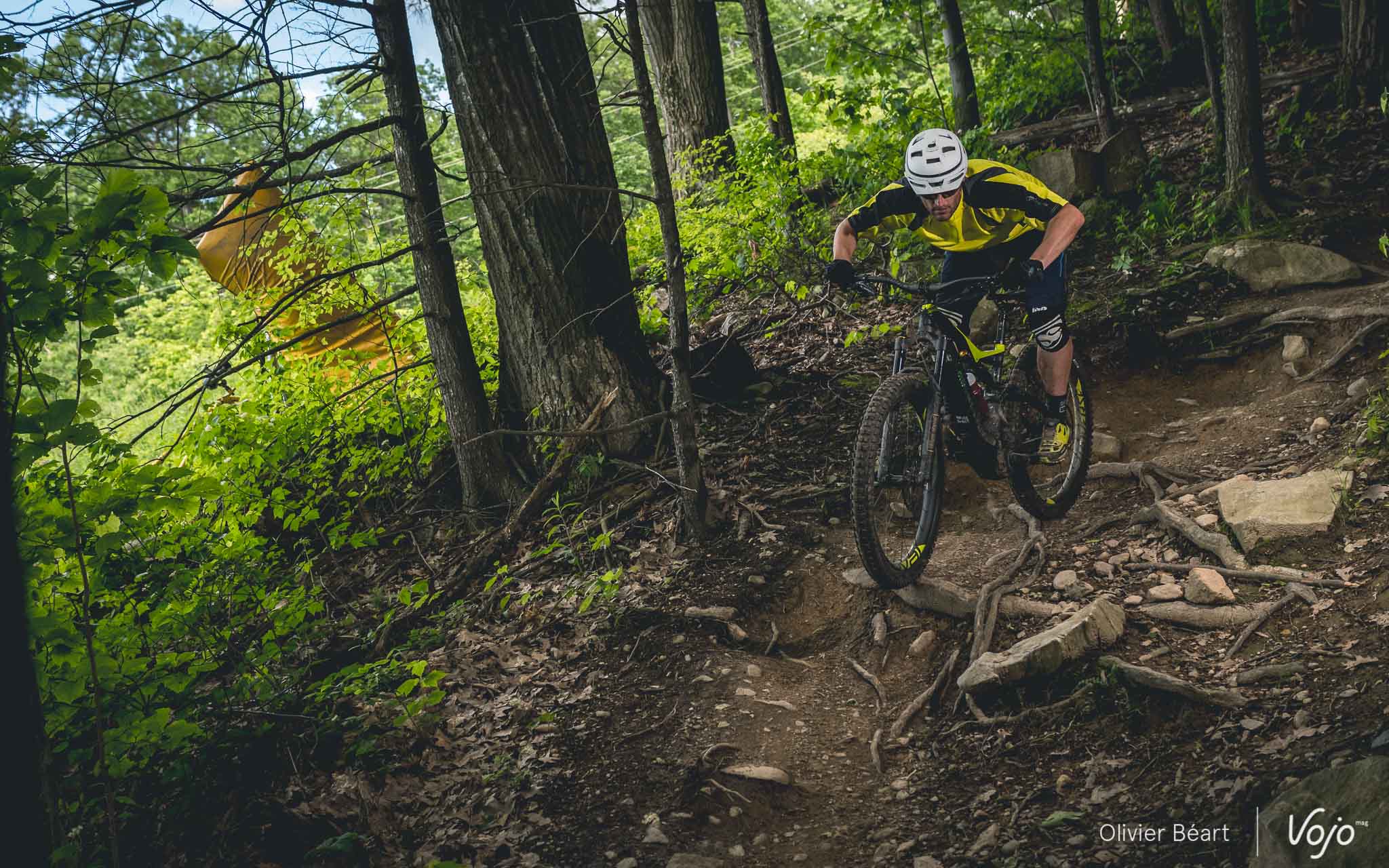 Pour cette première sortie, la découverte se fait en groupe. On se met en route et on grimpe jusqu’au sommet des pistes de la petite station de Mountain View, bien entendu sans prendre les remontées mécaniques. Je retrouve avec plaisir la discrétion et la souplesse caractéristiques du Levo. C’est toujours plus subtil qu’un Bosch, même avec la mise à jour e-MTB qui améliore pourtant les choses. Et le Shimano n’arrive pas non plus au même raffinement selon moi, d’autant que la coupure moteur du Levo est plus progressive encore avec ce nouveau moteur et la dernière gestion.
