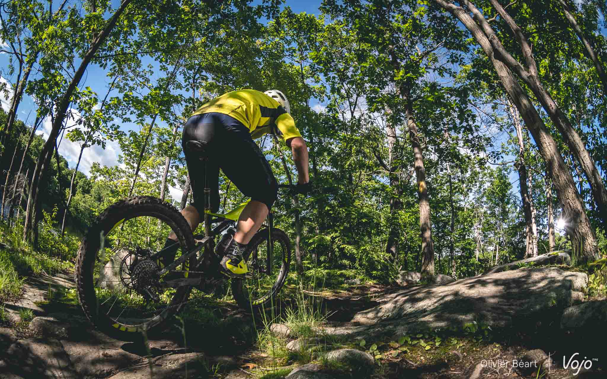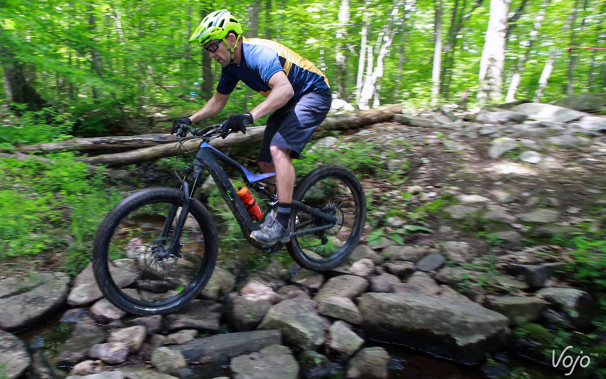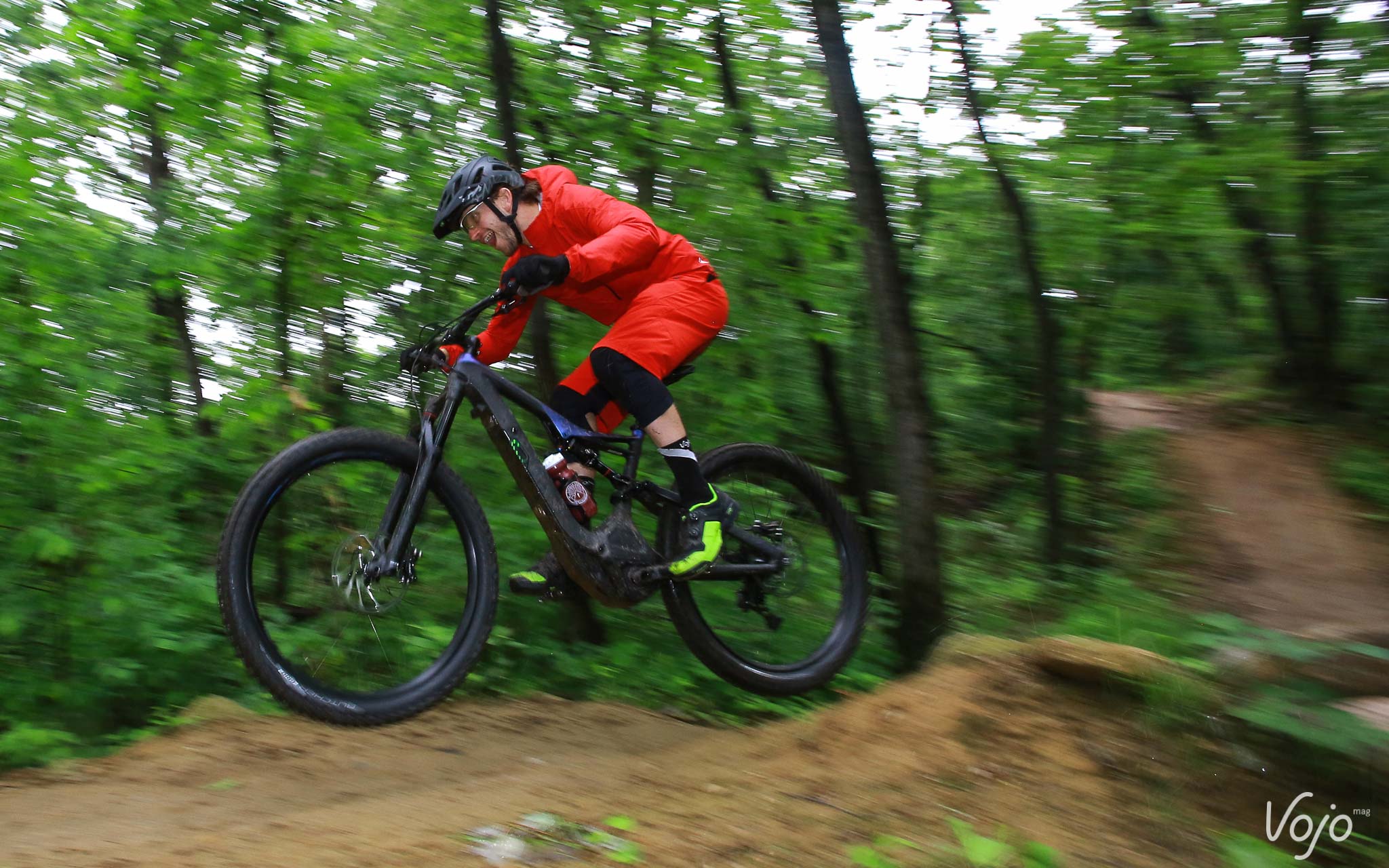 Une fois bien réglées, ces suspensions contribuent aussi à améliorer la dynamique du vélo, dans le sens où elles vont se montrer très fermes par rapport aux mouvements venant du pilote, et beaucoup plus souples par rapport à tout ce qui vient du terrain. Du moins si on roule vite, car à basse vitesse, on a du mal à les faire rentrer dans le débattement et à les amener dans la zone où elles travaillent le mieux. Bilan, les bunny-ups sont d’une facilité déconcertantes et enrouler les obstacles comme un chat se fait très naturellement. Plus en tout cas que sur le Comp, plus lourd mais aussi doté de suspensions plus « plush », c’est à dire plus souples en début de course et plus flatteuses.