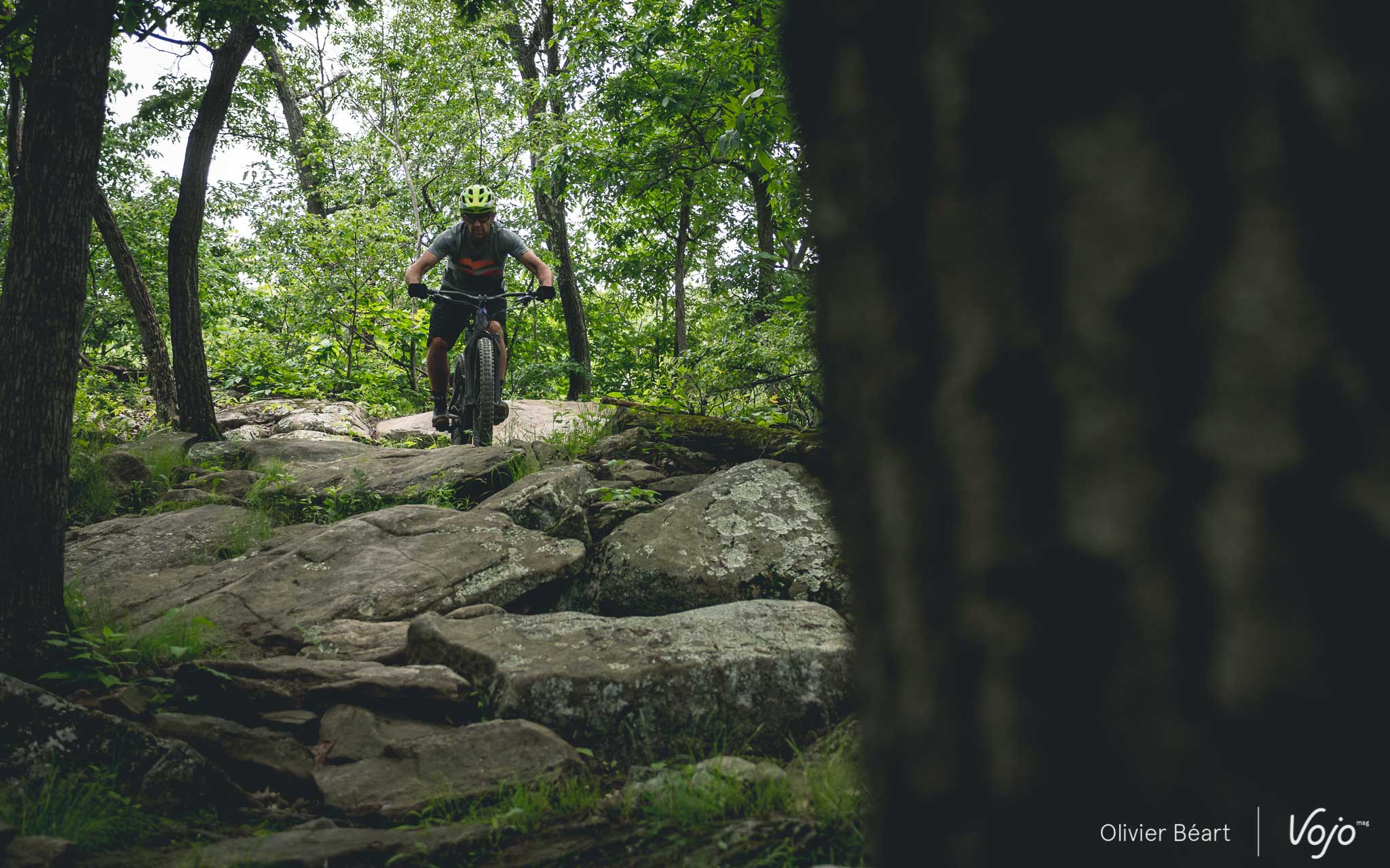 Au moment d’attaquer les zones en pierriers sur lesquelles nous avons aussi testé le nouvel Epic, j’apprécie vraiment le travail des suspensions. La nouvelle fourche RockShox Revelation n’a plus rien à voir avec l’ancienne et elle n’a pas grand chose à envier à la Pike. Son châssis est rigide et la cartouche Charger fonctionne à merveille. A l’arrière, l’amortisseur RockShox Monarch RT fait largement aussi bien le job que le Fox qu’il remplace, avec peut-être même un poil plus de sensibilité sur les petits chocs. Par contre, j’ai légèrement diminué la pression par rapport à celle donnée par l’Auto SAG (qui était neuf, ce qui peut expliquer qu’un léger rodage soit nécessaire).