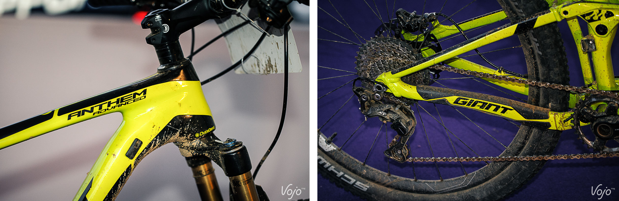 Le terme « Advanced » présent dans le nom de notre vélo de test signale qu’il dispose d’un triangle avant en carbone, mais l’arrière reste en aluminium car le gain de poids aurait été marginal en comparaison du surplus tarifaire. Les biellettes restent également en alu. L’Anthem Advanced est décliné en trois versions (0, la plus haut de gamme, puis 1 et 2), ainsi qu’en cadre 100% alu. On trouve également une déclinaison plus musclée baptisée Anthem X par Giant et qui est équipée d’une fourche de 120mm de débattement à l’avant et d’équipements qui se prêtent mieux à une pratique hard, comme par exemple une tige de selle télescopique.