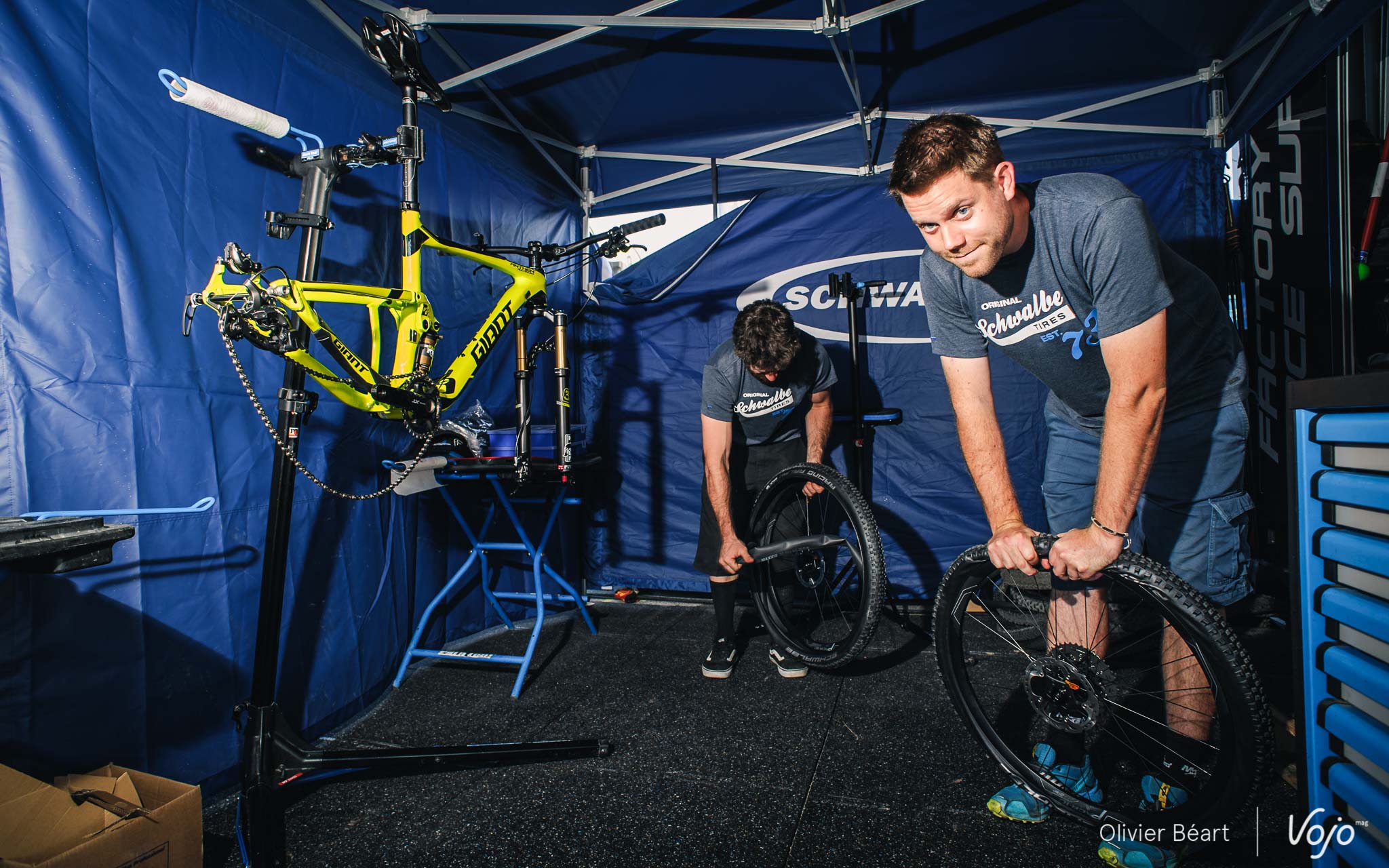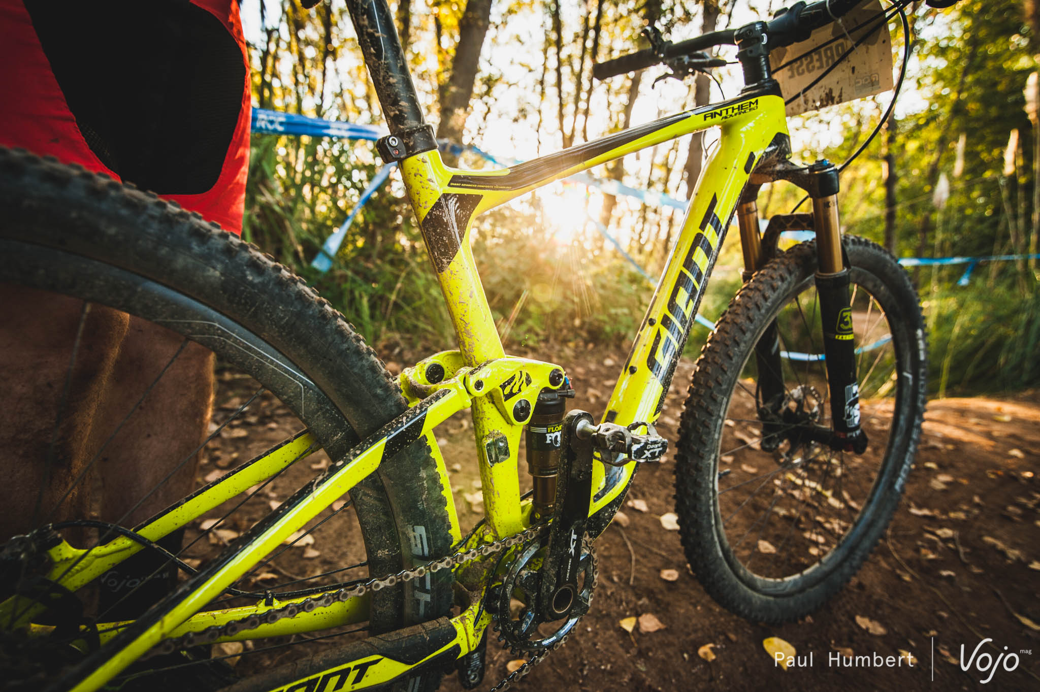 Notre Giant Anthem Advanced 2016 étant un des premiers exemplaires arrivés en France, il venait tout juste de sortir de son carton quand nous en avons pris possession la veille de la course. Notre test a donc commencé chez Schwalbe afin de passer les pneus en tubeless et d’en profiter pour remplacer la monte light d’origine par des modèles Snakeskin renforcés afin d’éviter que ce test ne se termine prématurément après le premier lâchage de freins en descente. Un choix payant, puisque nous n’avons pas rencontré le moindre souci sur ce Roc d’Azur malgré quelques franches attaques et de petits passages sur les bords de sentier jonchés de buissons peu accueillants lors de certains dépassements.
