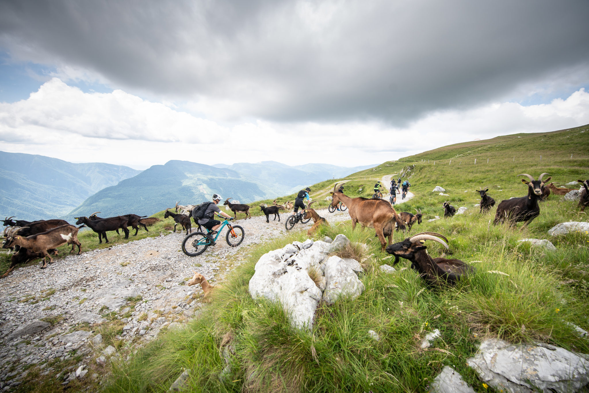 Aujourd’hui, la vue est hélas bouchée par les nuages. Les chèvres nous accueillent joyeusement et sans crainte. La première partie de la descente se fait sur une sorte de sentier invisible, où les cailloux piégeurs sont cachés sous l’herbe. Les pièges sont nombreux, tout comme les risques de taper le dérailleur et les manivelles. Mais il en faut visiblement plus pour impressionner notre XTR…