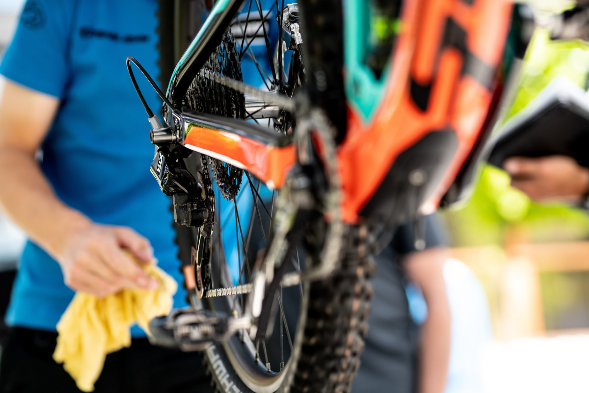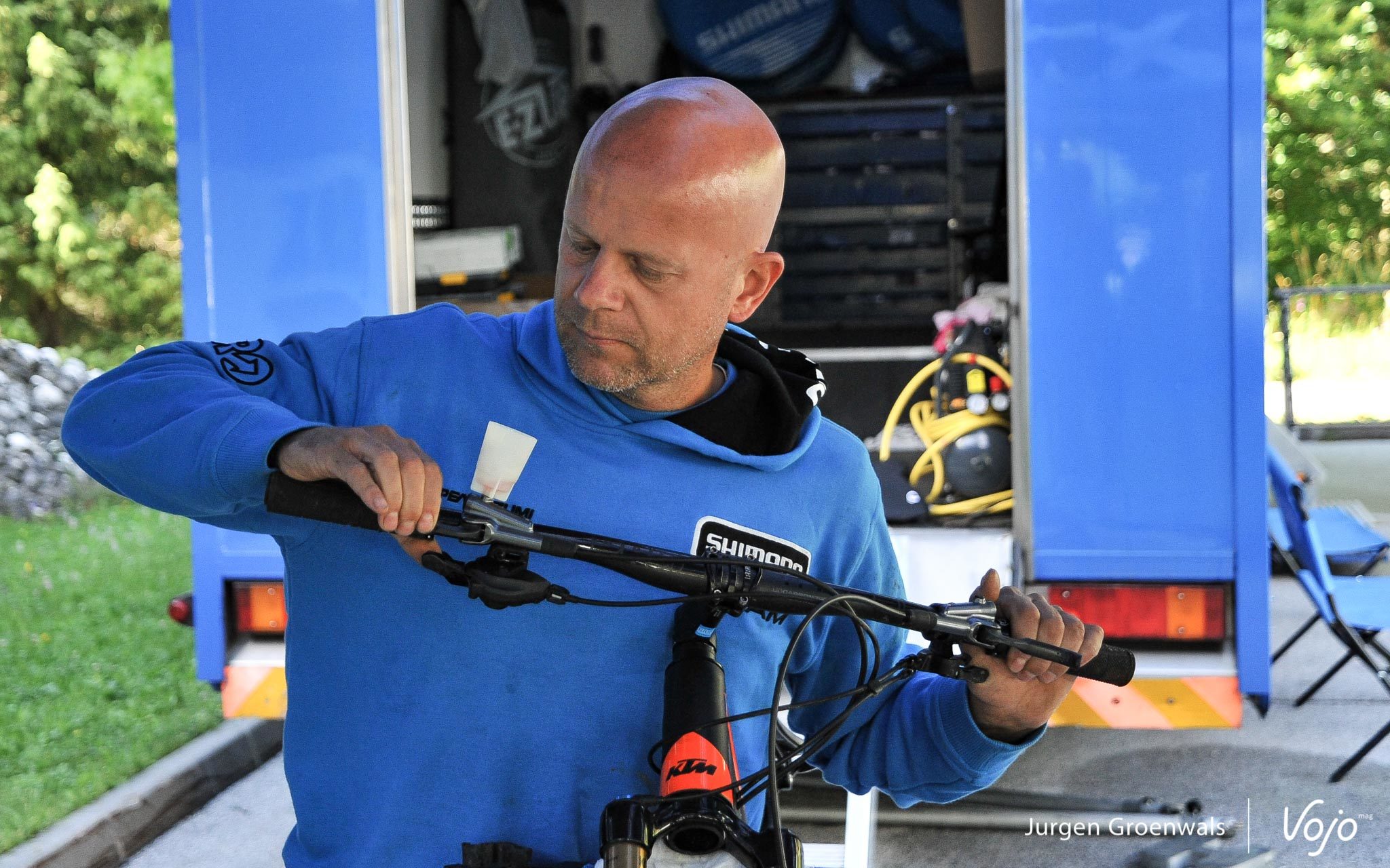 Nous passons d’abord dans les mains de l’assistance Fox pour un réglage des suspensions, puis nous allons du côté des techniciens de chez Shimano pour régler plus finement les composants XTR à notre goût et pour être sûr de bien profiter de toutes les possibilités d’ajustement.