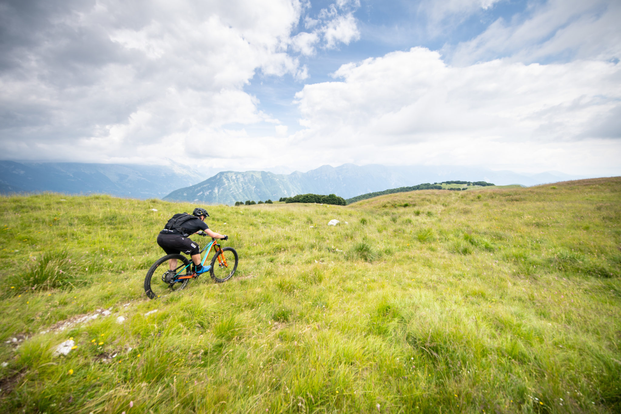 Bon, on s’est un peu écarté du terrain… mais vous ne réfléchissez jamais pendant une longue montée ? En attendant, nous voici au sommet. Nous regardons les trois pays qui nous entourent, on enfile nos petites genouillères (même sur un XC, pour ce genre de terrain, on n’est jamais trop prudent), et nous nous préparons à entamer la vraie partie de plaisir avec la descente. Ici, ce sont les freins sur lesquels nous allons nous concentrer.