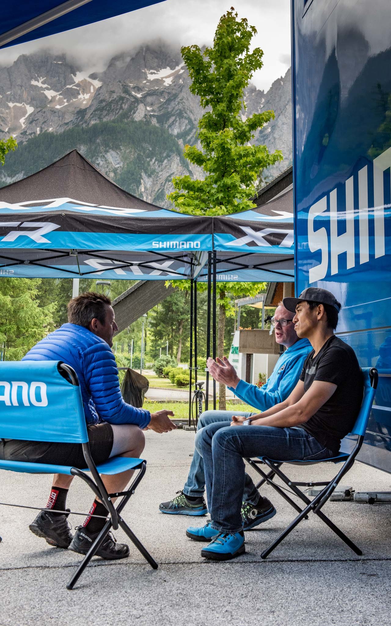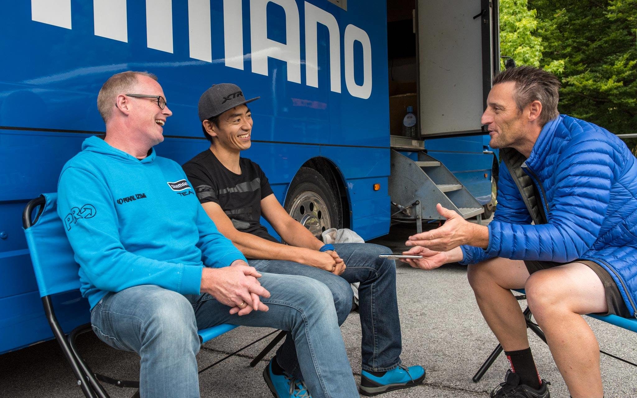 Outre l’essai des produits, nous avons profité de cette présentation du nouveau groupe Shimano XTR M9100 et de ses déclinaisons pour nous entretenir avec Takao Harada et Henry Bosch (ça ne s’invente pas), qui ne sont autres que les « pères » de ce nouvel XTR. Face au bus bleu Shimano, nous avons parlé vis, boulons, dents, choix de matériaux, concurrence avec Sram ou encore comment un Néerlandais et un Japonais travaillent ensemble sur un tel projet. Interview croisée :