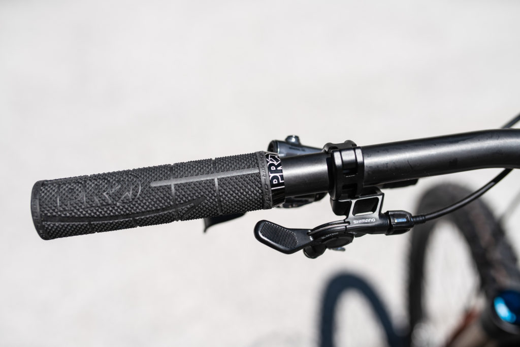 Ce qui est clair dès le départ lors de cette phase de réglages, c’est que le nouveau collier i-Spec EV rend encore plus facile l’ajustement de la position du shifter. 14mm en latéral et 60 degrés pour l’angle : dur de ne pas trouver la position qui colle aux goûts de chacun. Et cela pour le shiter lui-même, mais aussi pour les leviers de freins. Vous noterez aussi au passage le petit insert en caoutchouc qui évite tout glissement des doigts, et qui se révèle bien agréable à l’usage.