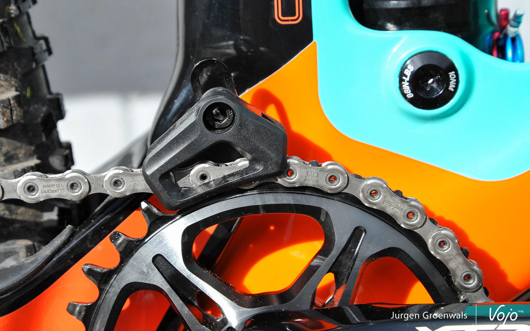 La tige de selle Pro Koryak retient notre attention. Même si elle n’a que 120mm de course ici, ce qui est un peu peu pour le Genius (mais la marque d’accessoires de Shimano a depuis présenté des versions en 150 et même 170mm), son fonctionnement ne soulève aucune critique. Et on peut profiter aussi de la commande liée au groupe XTR et qui s’intègre harmonieusement au cockpit grâce à l’i-Spec EV qui offre aussi une large plage de réglages, comme pour le shifter placé à droite. On apprécie aussi que Shimano ait placé un caoutchouc nervuré pour améliorer le grip. Enfin, le guide-chaîne Shimano, pas indispensable car le maintien par le plateau est déjà très bon, offre une sécurité supplémentaire.