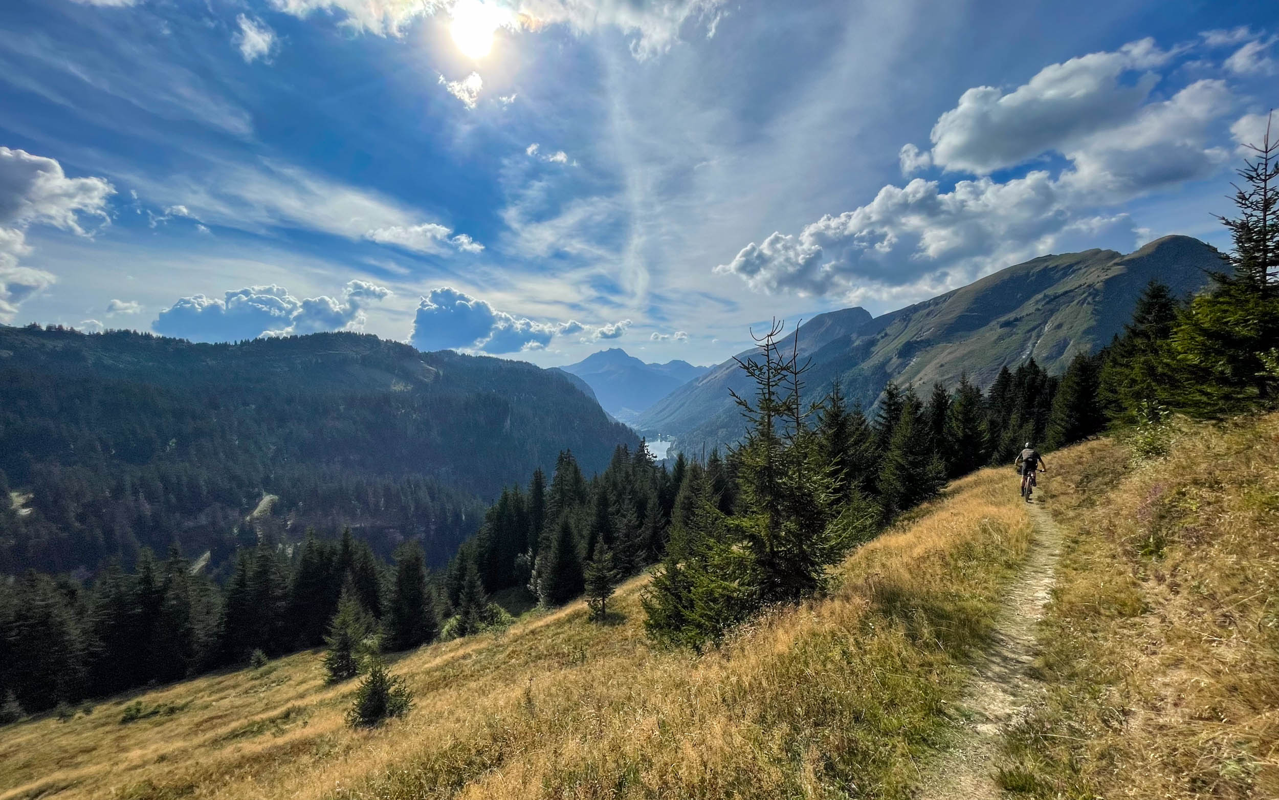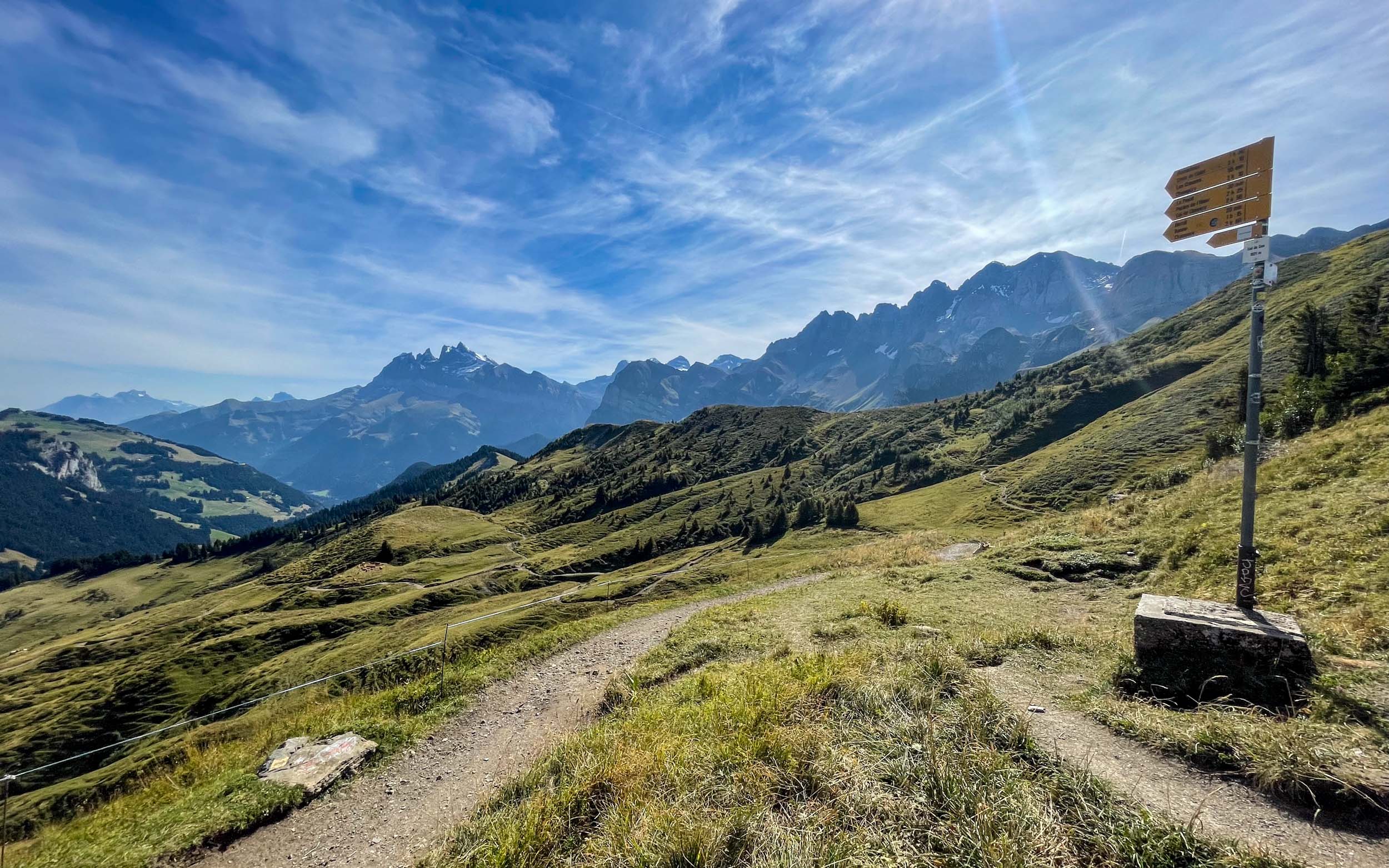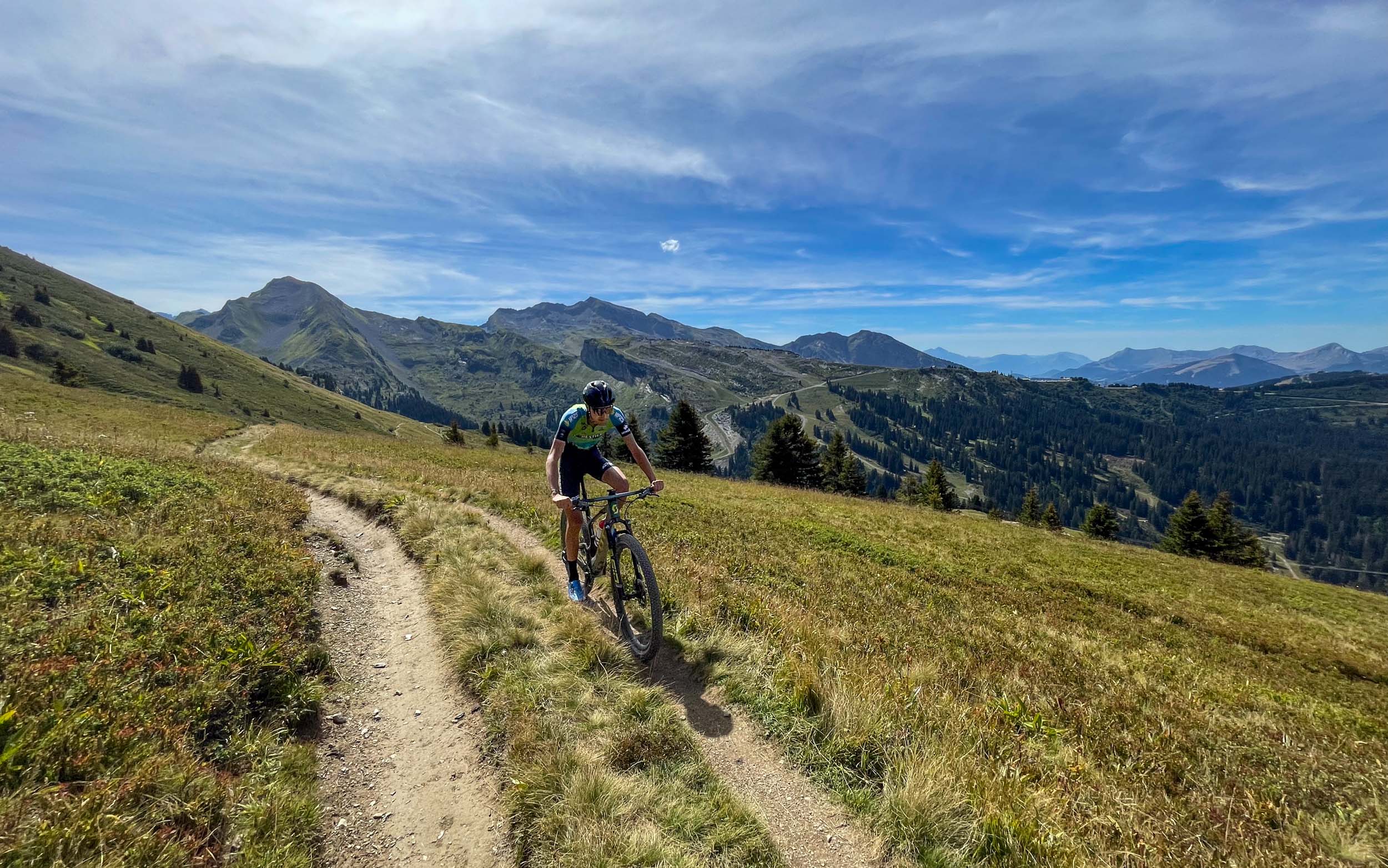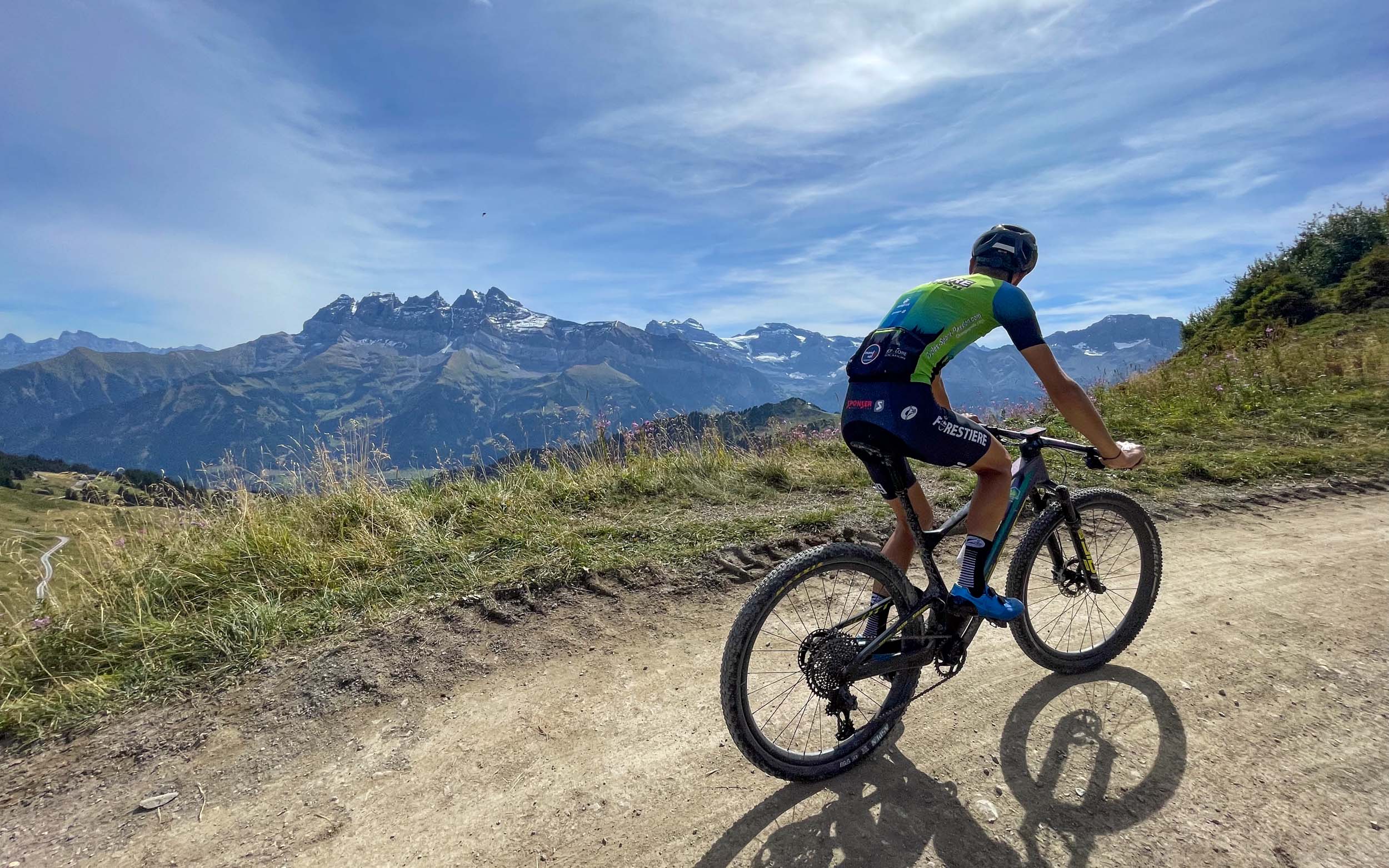 Enfin, le col de Coux pointe à l’horizon, synonyme de frontière franco-suisse. Le panorama sur les Dents du Midi est somptueux. Une courte descente cassante et sinueuse nous mène au-dessus de Champéry avant d’entamer une longue portion en balcon sur des chemins roulants.