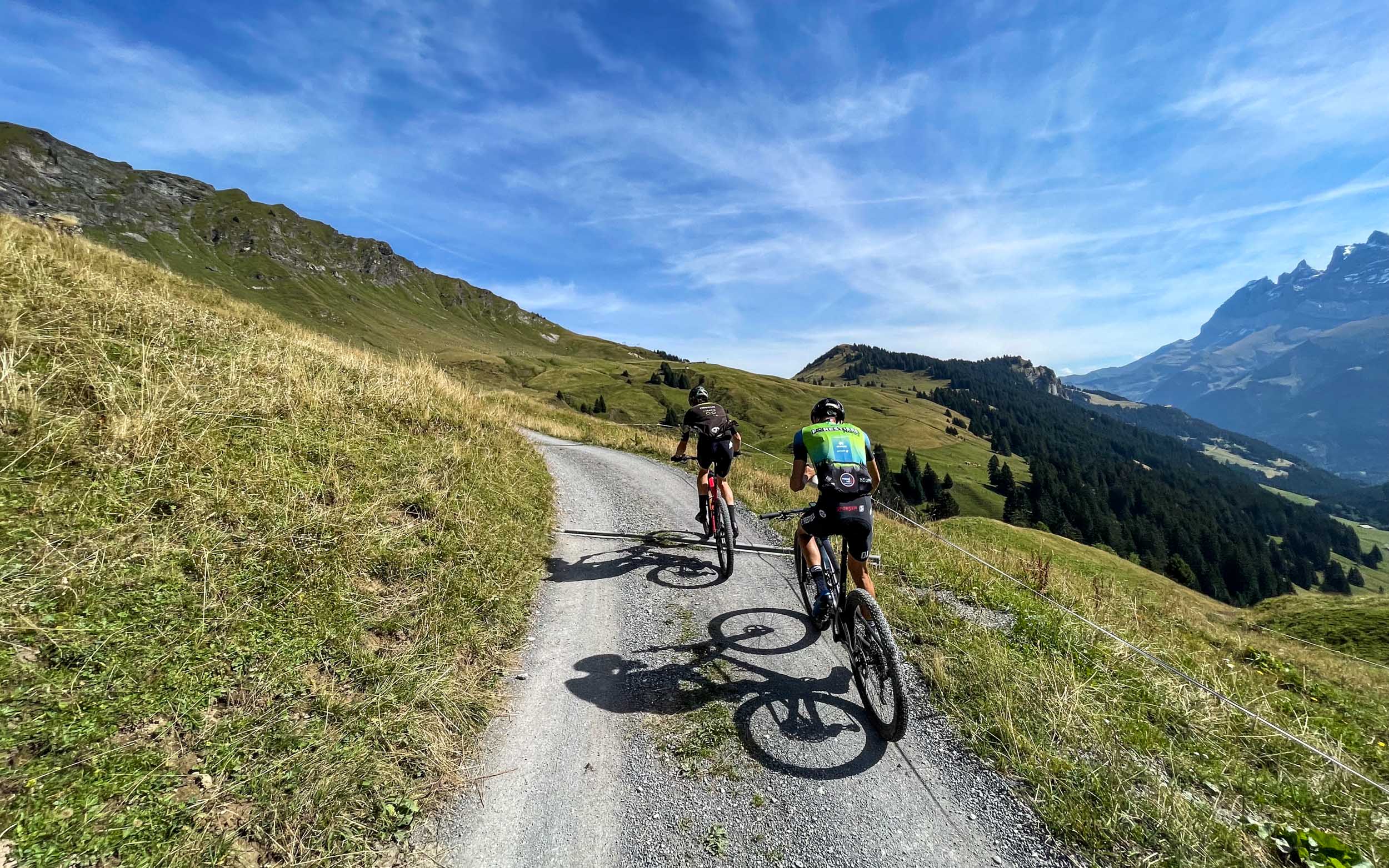 À la sortie de Morzine, nous attaquons par un chemin large qui étirera le peloton, la première boucle de 10 km aura pour but de faire une première sélection avec près de 600 m de dénivelé. C’est ensuite que les choses se corsent : 10 km d’ascension pour 900 m de dénivelé, plus nous avançons, plus c’est raide, et les trois derniers kilomètres sont interminables ! Nous sommes tous les trois unanimes pour affirmer qu’un plateau de 32 dents semble adapté à ce début de parcours.