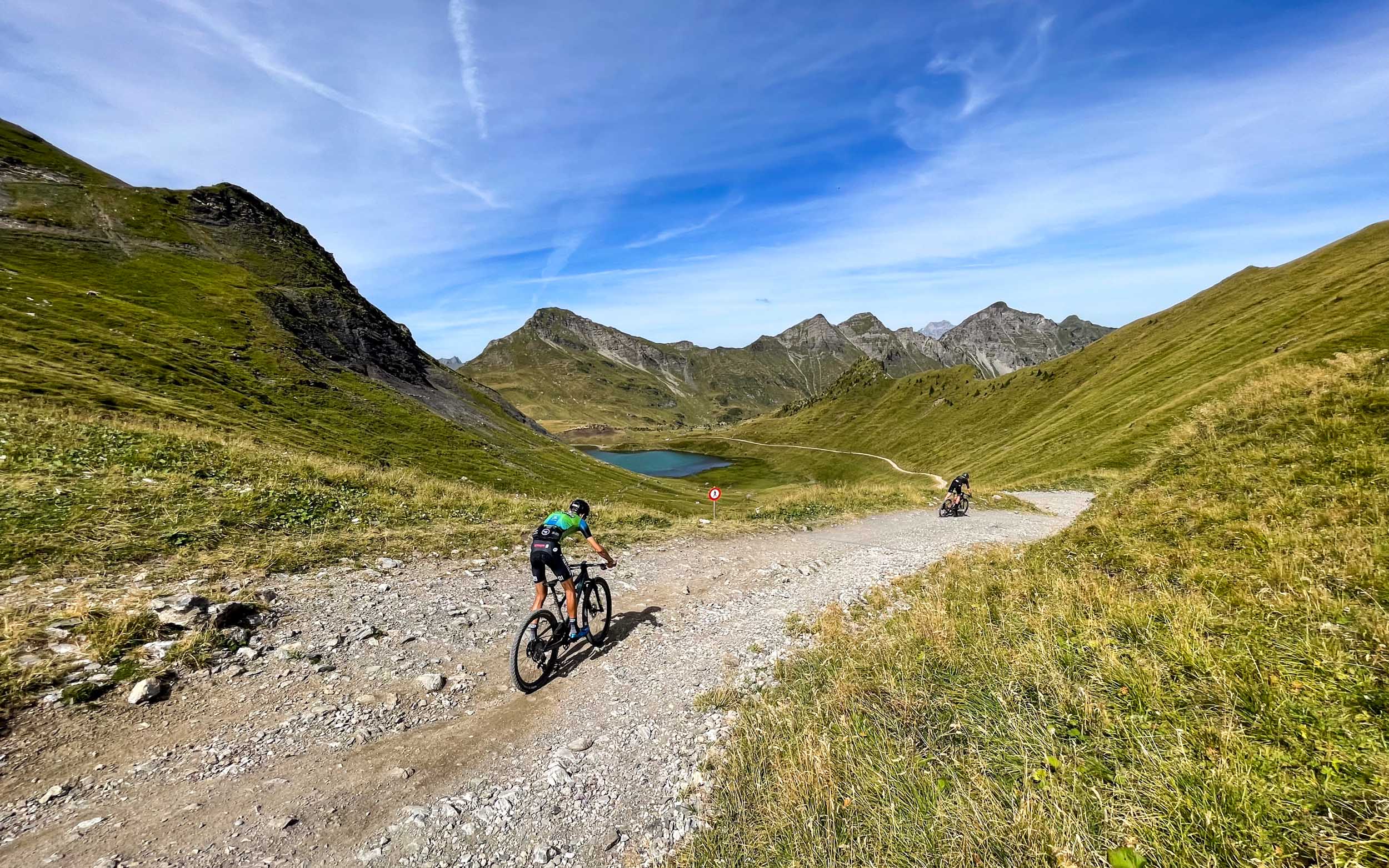 Après le contournement de ce petit lac d’altitude, le passage au refuge de Chésery marque le départ d’un single ludique et rapide. Surprise au détour d’un virage, nous croisons des têtes bien connues : Martin Vidaurre, Gwendalyn Gibson, Carter Woods ainsi que Riley Amos sont en train de préparer la manche de coupe du monde XCO des Gets.