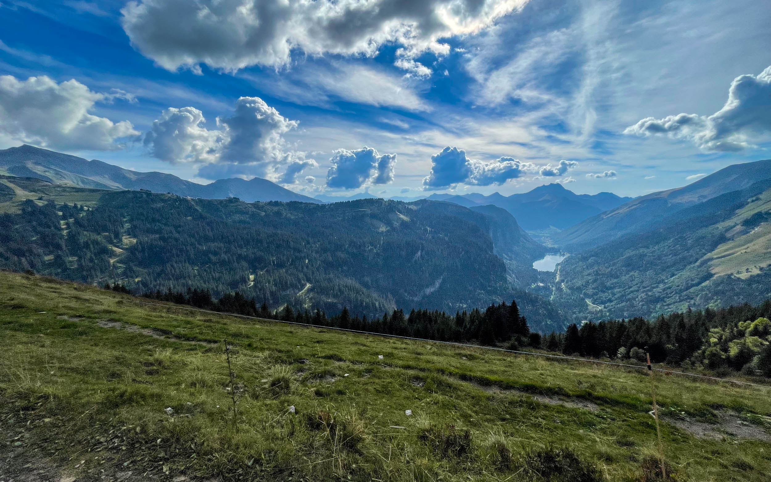 Quelques heures après l’avoir quittée avec le passage du col de Coux, nous voilà de retour en France. Nous descendons sur la tête des Lindarets via un petit single bien typé montagnard pour arriver directement au milieu des descendeurs et enduristes profitant des multiples remontées mécaniques des Portes du soleil. Cuissards et petit débattement, nous semblons comme des intrus… Qu’importe, la descente sur le village de Châtel s’annonce ludique, sûrement via l’une des nombreuses pistes du bikepark.