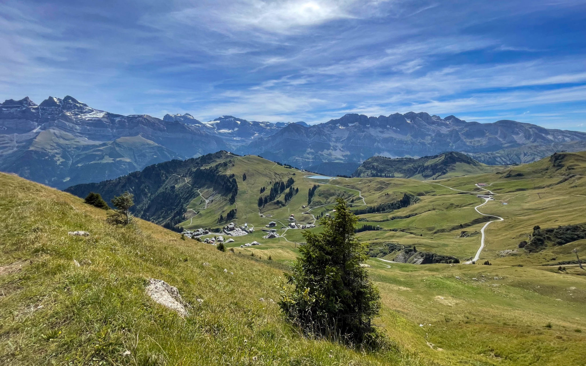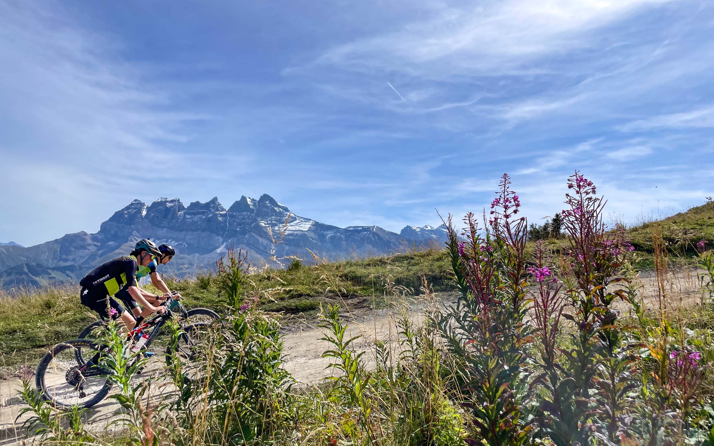 Enfin, le col de Coux pointe à l’horizon, synonyme de frontière franco-suisse. Le panorama sur les Dents du Midi est somptueux. Une courte descente cassante et sinueuse nous mène au-dessus de Champéry avant d’entamer une longue portion en balcon sur des chemins roulants.