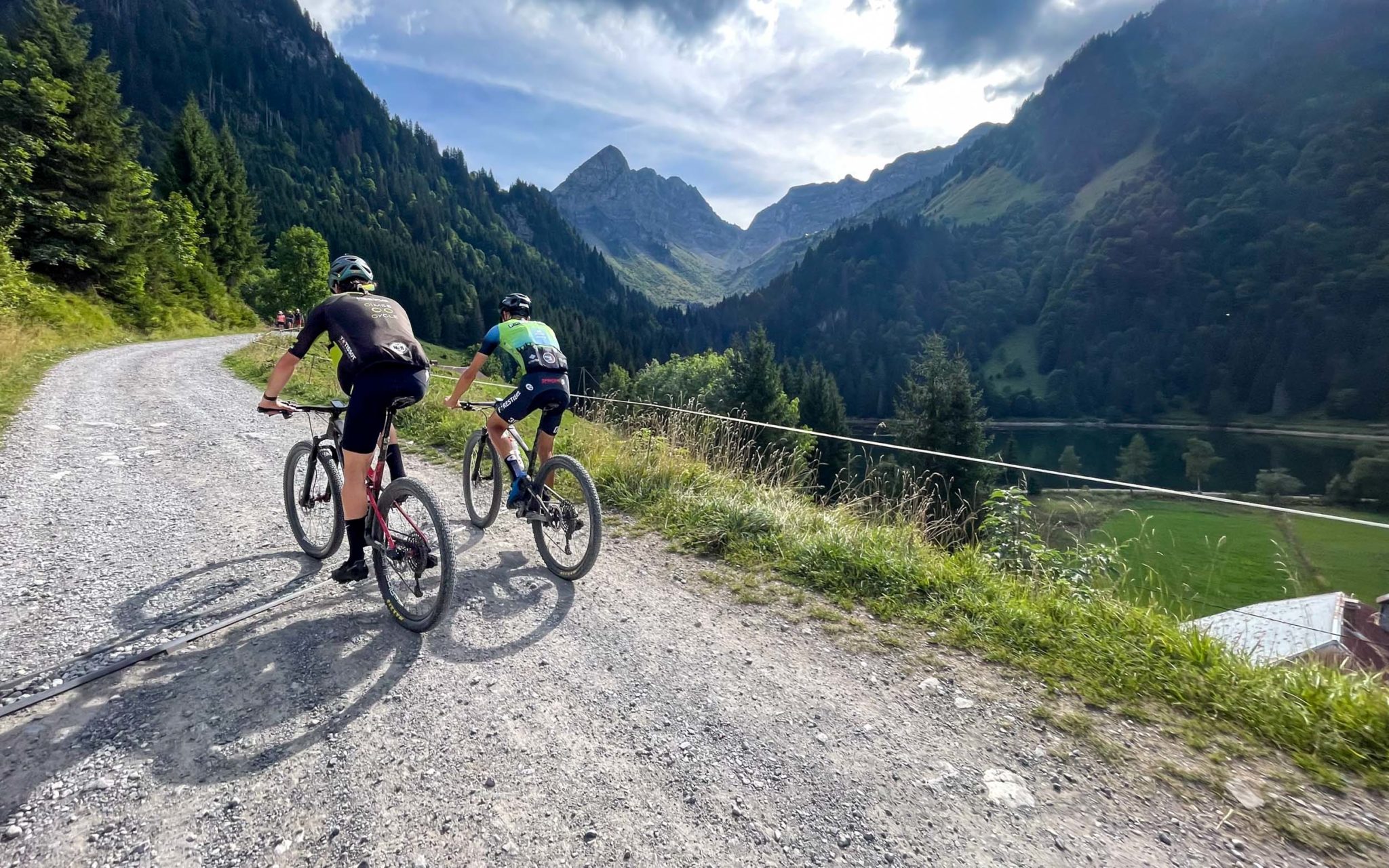 Après le contournement de ce petit lac d’altitude, le passage au refuge de Chésery marque le départ d’un single ludique et rapide. Surprise au détour d’un virage, nous croisons des têtes bien connues : Martin Vidaurre, Gwendalyn Gibson, Carter Woods ainsi que Riley Amos sont en train de préparer la manche de coupe du monde XCO des Gets.