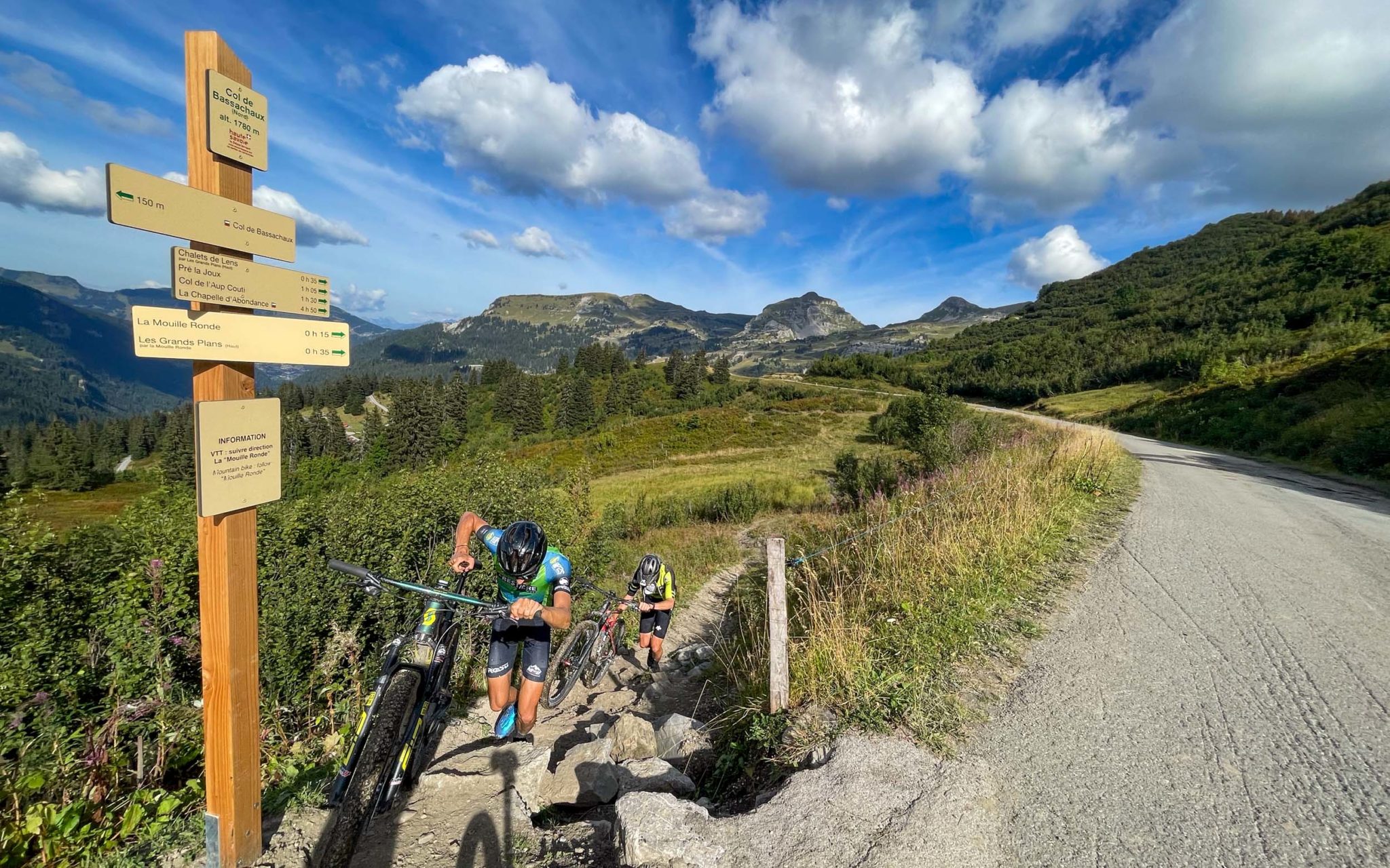 À la sortie de Morzine, nous attaquons par un chemin large qui étirera le peloton, la première boucle de 10 km aura pour but de faire une première sélection avec près de 600 m de dénivelé. C’est ensuite que les choses se corsent : 10 km d’ascension pour 900 m de dénivelé, plus nous avançons, plus c’est raide, et les trois derniers kilomètres sont interminables ! Nous sommes tous les trois unanimes pour affirmer qu’un plateau de 32 dents semble adapté à ce début de parcours.