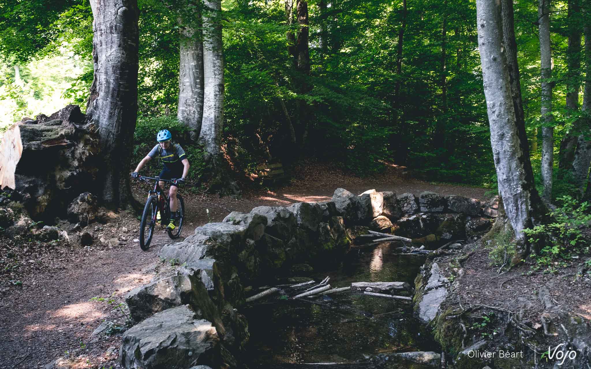 Là où nous avons tout particulièrement apprécie l’Agonist, c’est lorsque nous avons commencé à nous enfoncer dans les sous-bois et à serpenter dans la vallée très encaissée du Simmental… où notre photographe du jour ne nous a hélas pas suivis pour qu’on puisse vous montrer ce beau terrain de jeu. Là, les racines succèdent aux racines et le vélo semble doté d’une capacité hors du commun à conserver la vitesse et à donner l’impression qu’on flotte au-dessus des obstacles. Les suspensions fonctionnent en parfait accord et les manivelles ont le bon goût de ne pas venir taper trop souvent le sol, preuve que les suspensions travaillent en restant haut dans le débattement et en gardant de la réserve.