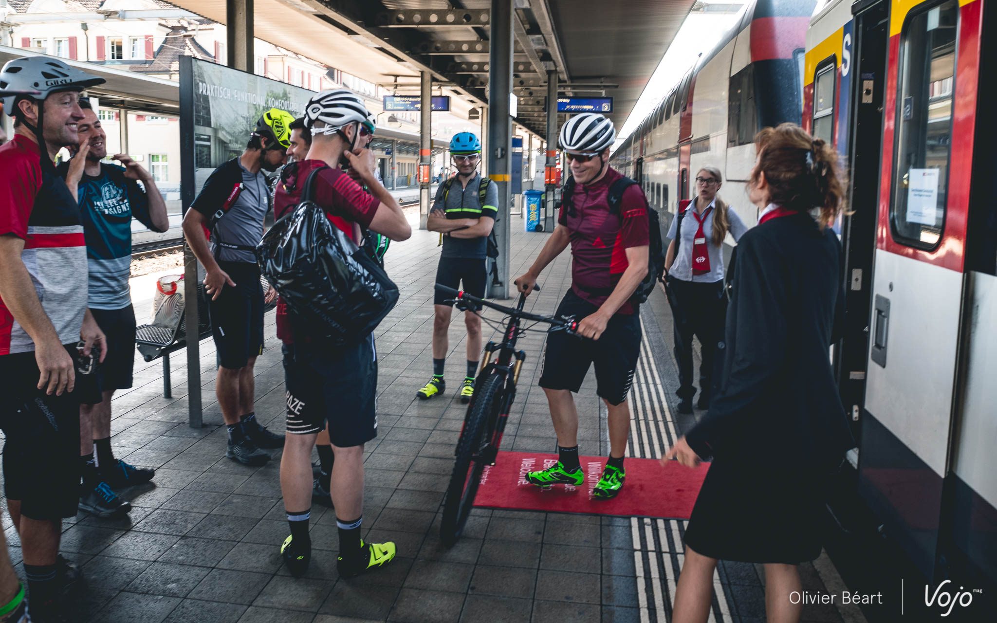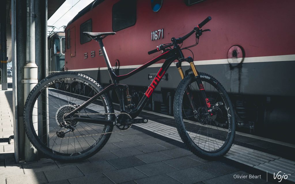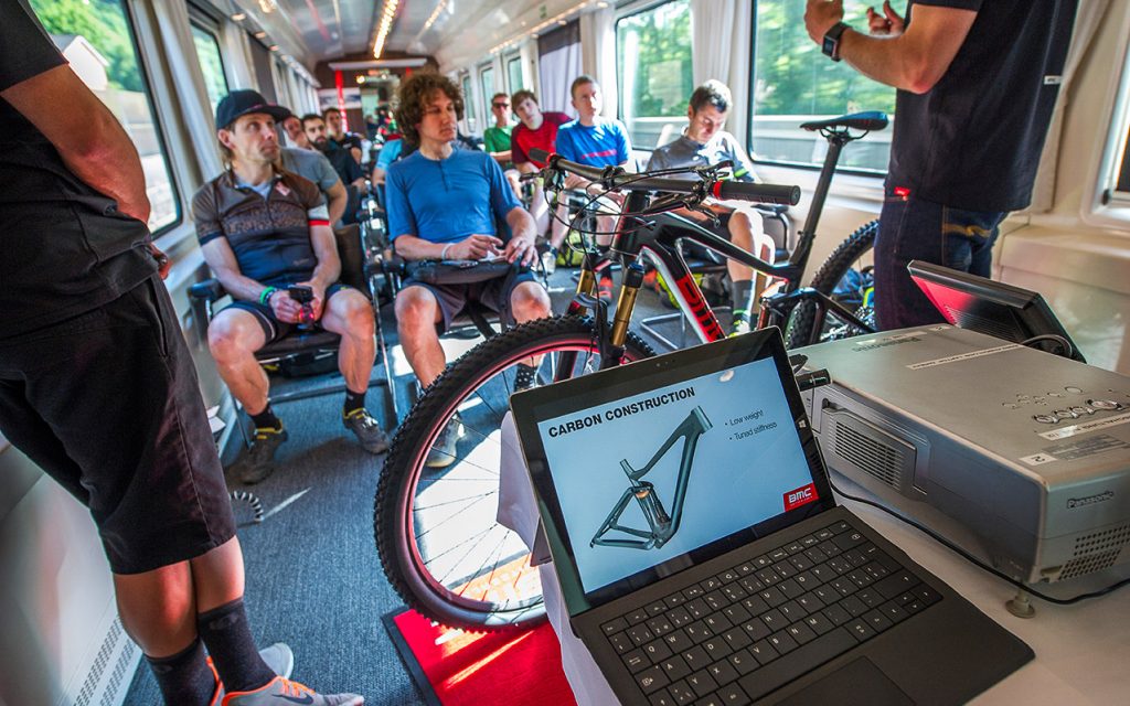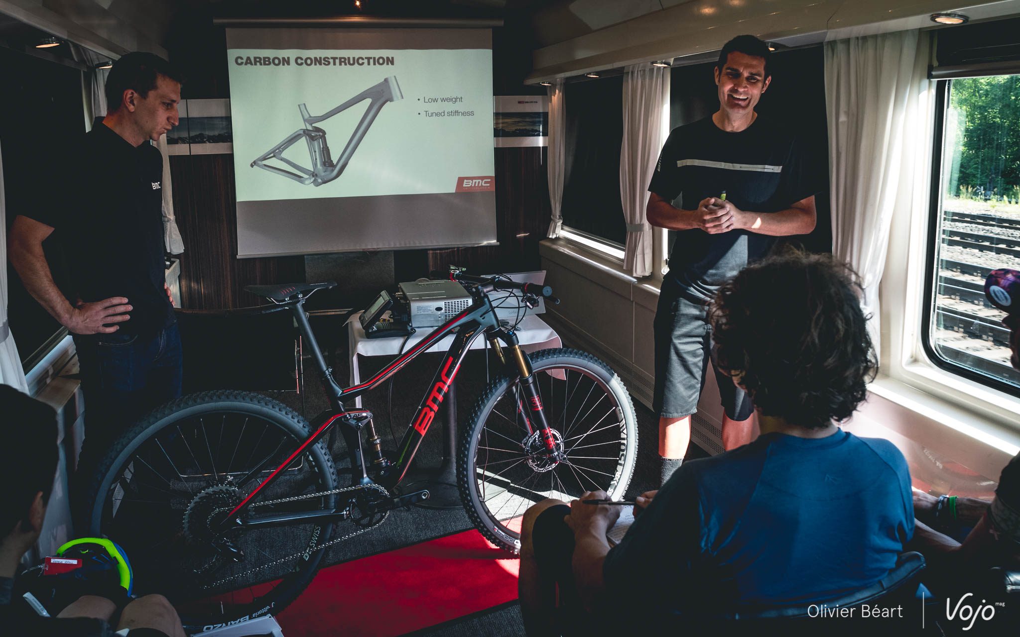 Jouant la carte de l’originalité et profitant des portes ouvertes par son partenariat avec Swiss Tourism, c’est dans un… train en gare de Zurich que BMC nous a donné rendez-vous pour la présentation de ce modèle. Vu qu’on sait que ce n’est pas un pur XC mais plutôt un vélo dédié à l’évasion même s’il entend rester performant, c’est plutôt cohérent.
