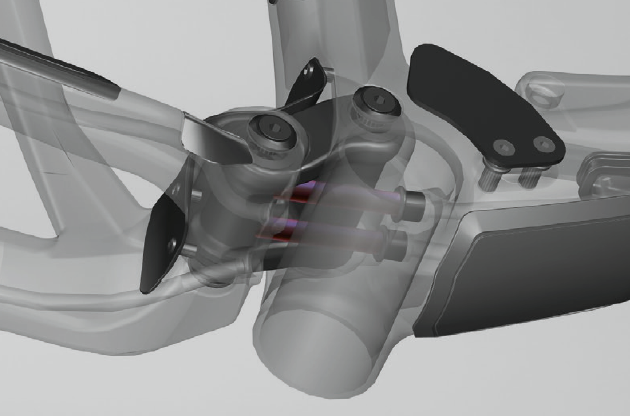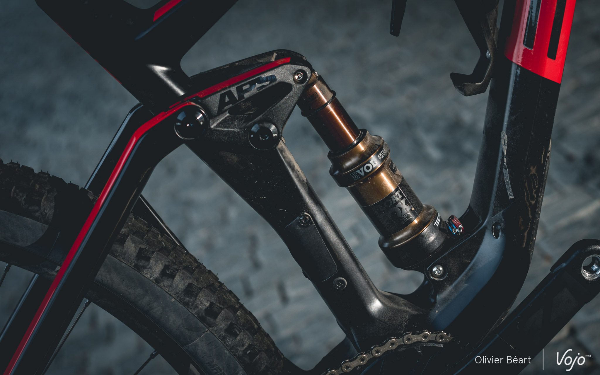 Enfin, si la biellette supérieure (toujours en alu) garde un aspect familier, son homologue inférieure évolue en profondeur. Non seulement elle est enfouie dans le cadre juste au-dessus du boîtier de pédalier, mais elle joue un autre rôle, qui nous donne l’occasion de faire la transition avec le chapitre suivant…