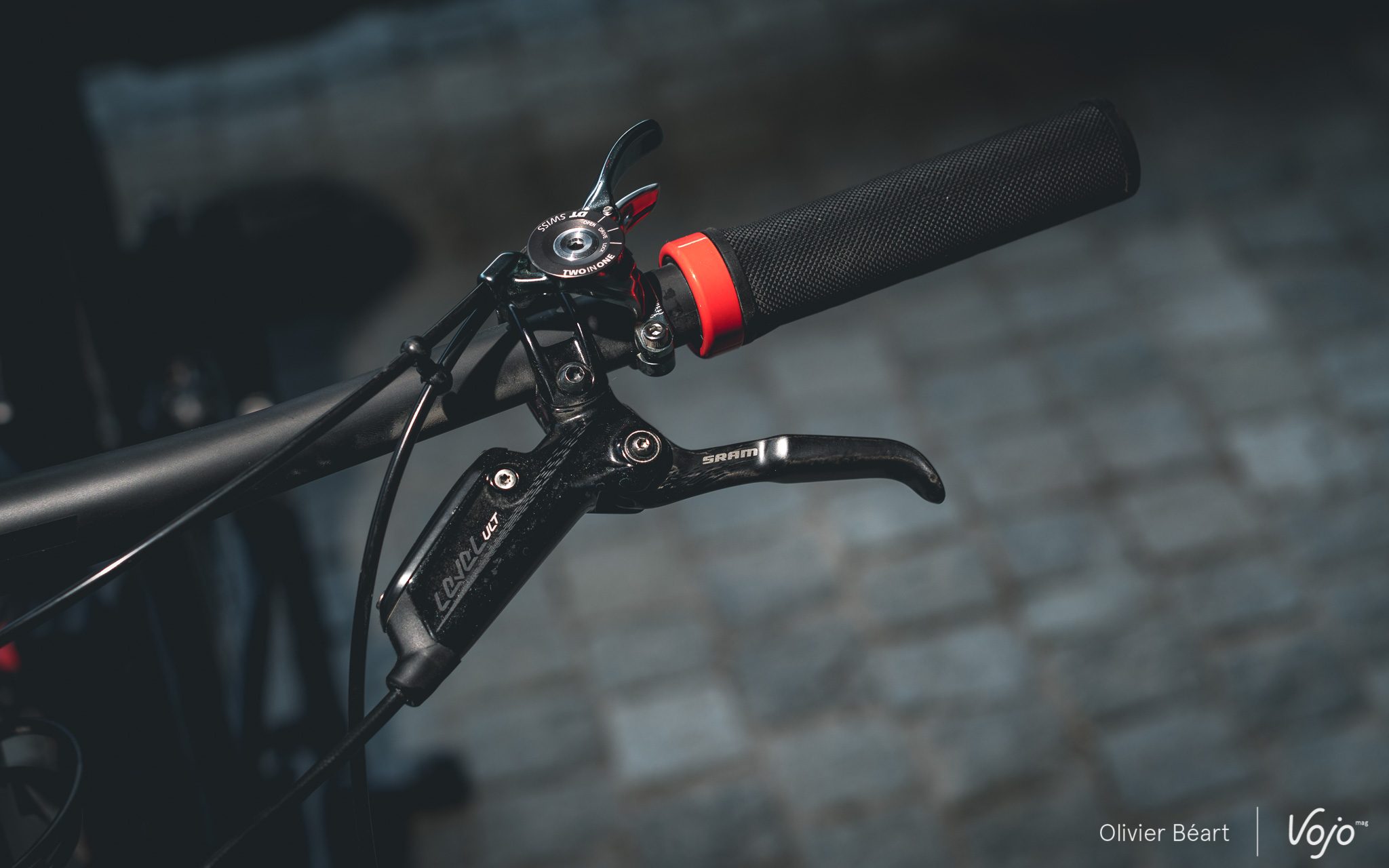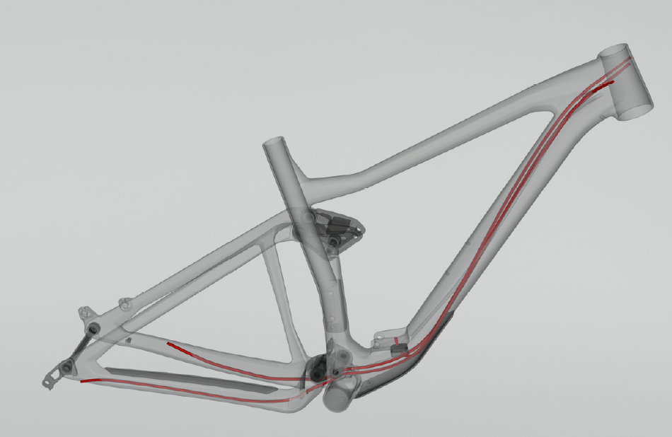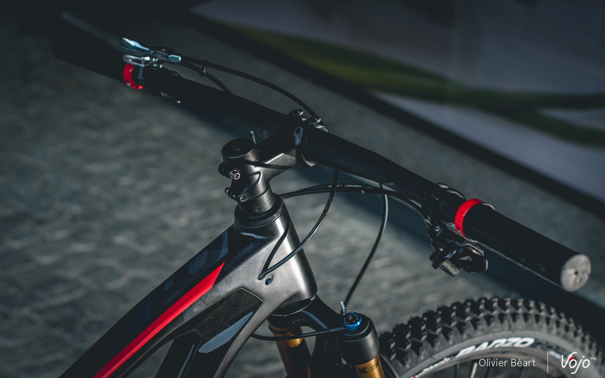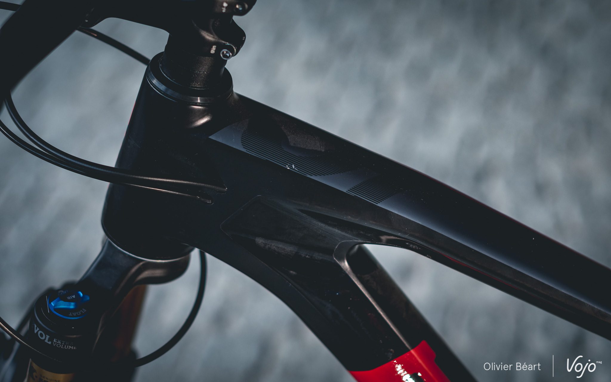 Le passage des gaines et Durit se fait par l’intérieur du cadre, via des tubes en carbone qui permettent un guidage intégral de l’entrée à la sortie, selon un système similaire à celui initié par Specialized sur le Stumpjumper, avec des tubes carbone installés dès la fabrication pour éviter les prises de tête lors des opérations de mécanique. Bien vu !