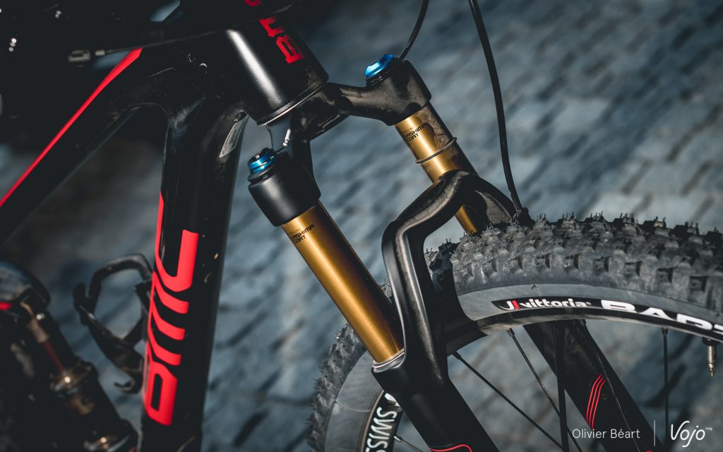 Les suspensions sont confiées à Fox, avec un amortisseur Float et une toute nouvelle fourche F32 Boost allégée par rapport à la précédente génération. Attention, il ne s’agit pas de la fameuse StepCast hyper légère et limitée à 100mm de débattement, mais bien d’une évolution de la F32 classique, plus légère (moins de 1600g) mais plus large car compatible 27,5+ (même si ce n’est pas le cas de ce vélo) et surtout plus rigide grâce au Boost et à un châssis aux formes modifiées. Un blocage DT Swiss prend place sur le cintre pour jouer avec les 3 modes… une solution maligne de BMC en attendant que Fox propose enfin un remote fiable et digne de ce nom !