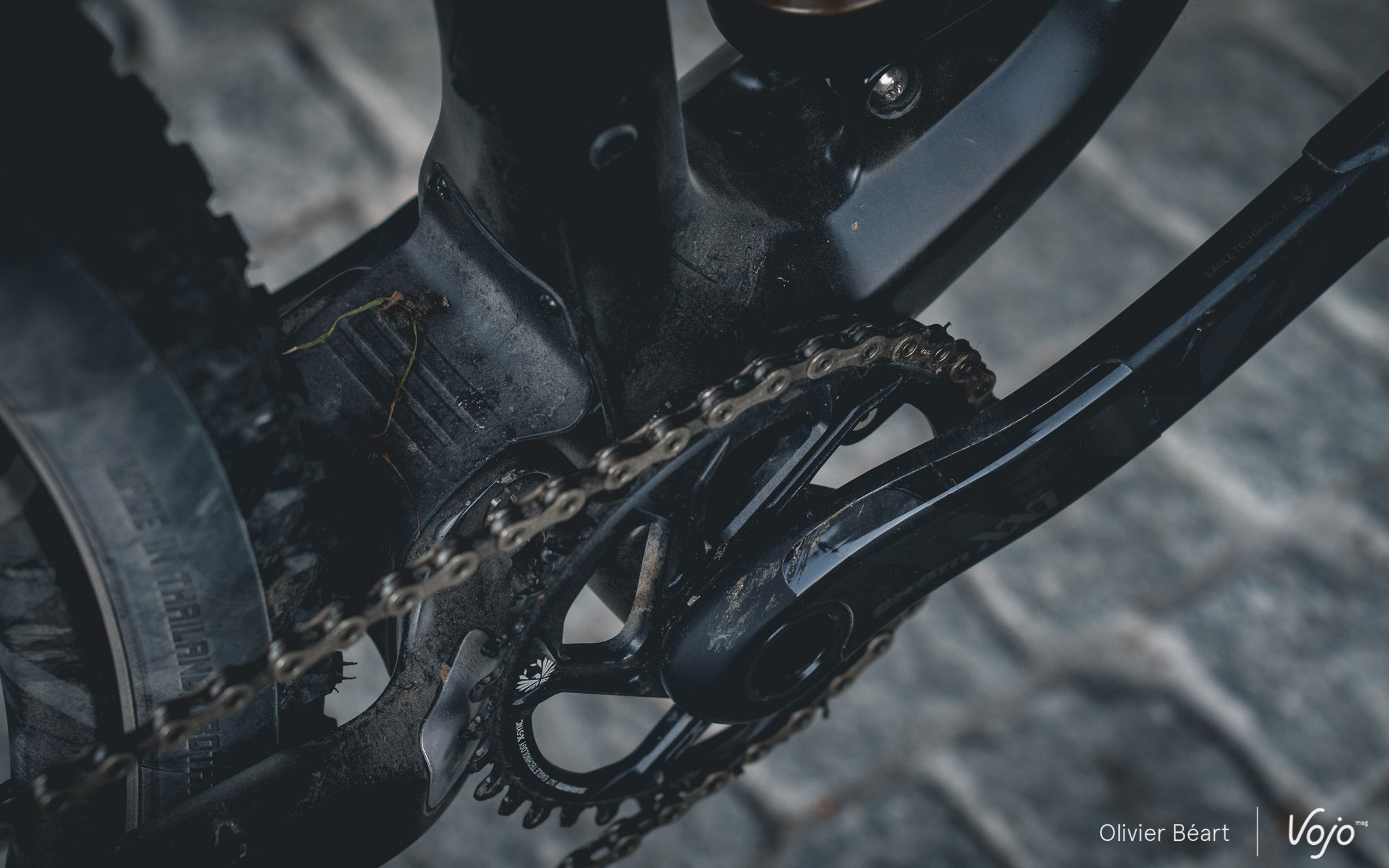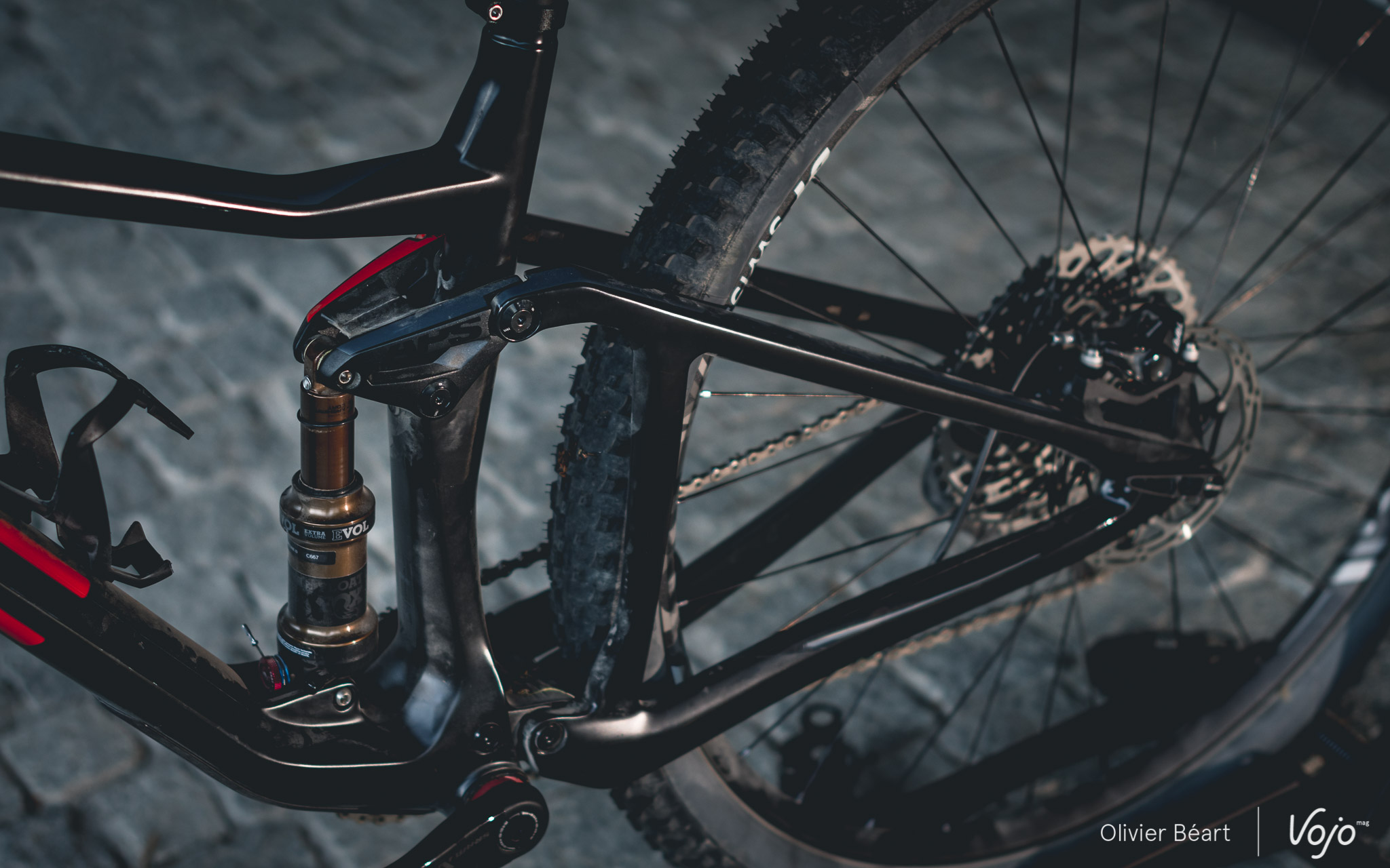 Le débattement est de 110mm et la valeur d’anti-squat (anti-pompage) reste très élevée (95% sur un plateau de 32 dents) de sorte à conserver un excellent rendement et du dynamisme, mais avec tout de même une philosophie plus orientée vers la facilité de contrôle de la machine et la réduction de la fatigue que sur un pur XC. Un petit indicateur de SAG se trouve entre la biellette et le hauban droit pour faciliter les réglages.