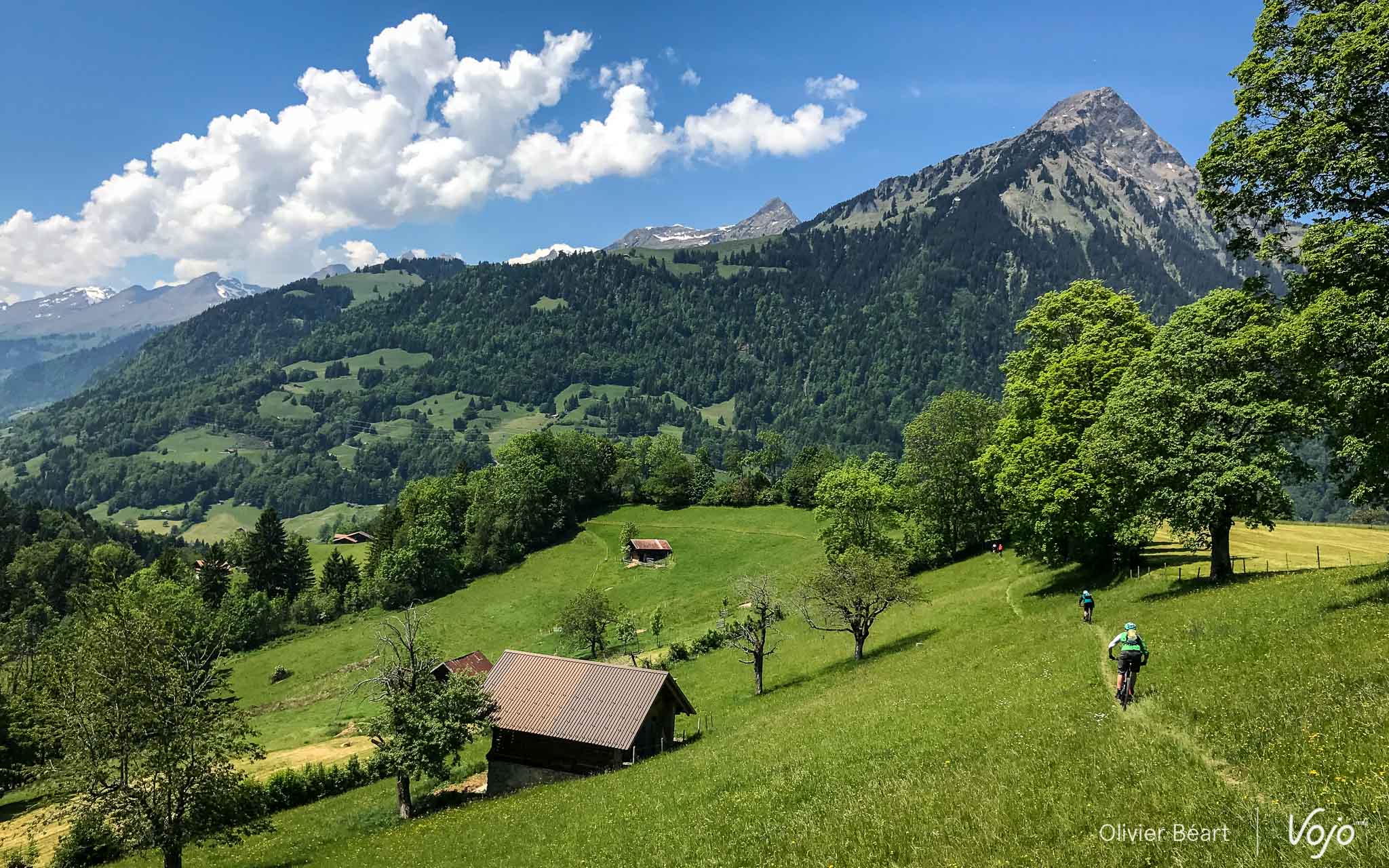 Là où nous avons tout particulièrement apprécie l’Agonist, c’est lorsque nous avons commencé à nous enfoncer dans les sous-bois et à serpenter dans la vallée très encaissée du Simmental… où notre photographe du jour ne nous a hélas pas suivis pour qu’on puisse vous montrer ce beau terrain de jeu. Là, les racines succèdent aux racines et le vélo semble doté d’une capacité hors du commun à conserver la vitesse et à donner l’impression qu’on flotte au-dessus des obstacles. Les suspensions fonctionnent en parfait accord et les manivelles ont le bon goût de ne pas venir taper trop souvent le sol, preuve que les suspensions travaillent en restant haut dans le débattement et en gardant de la réserve.