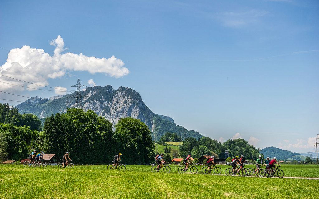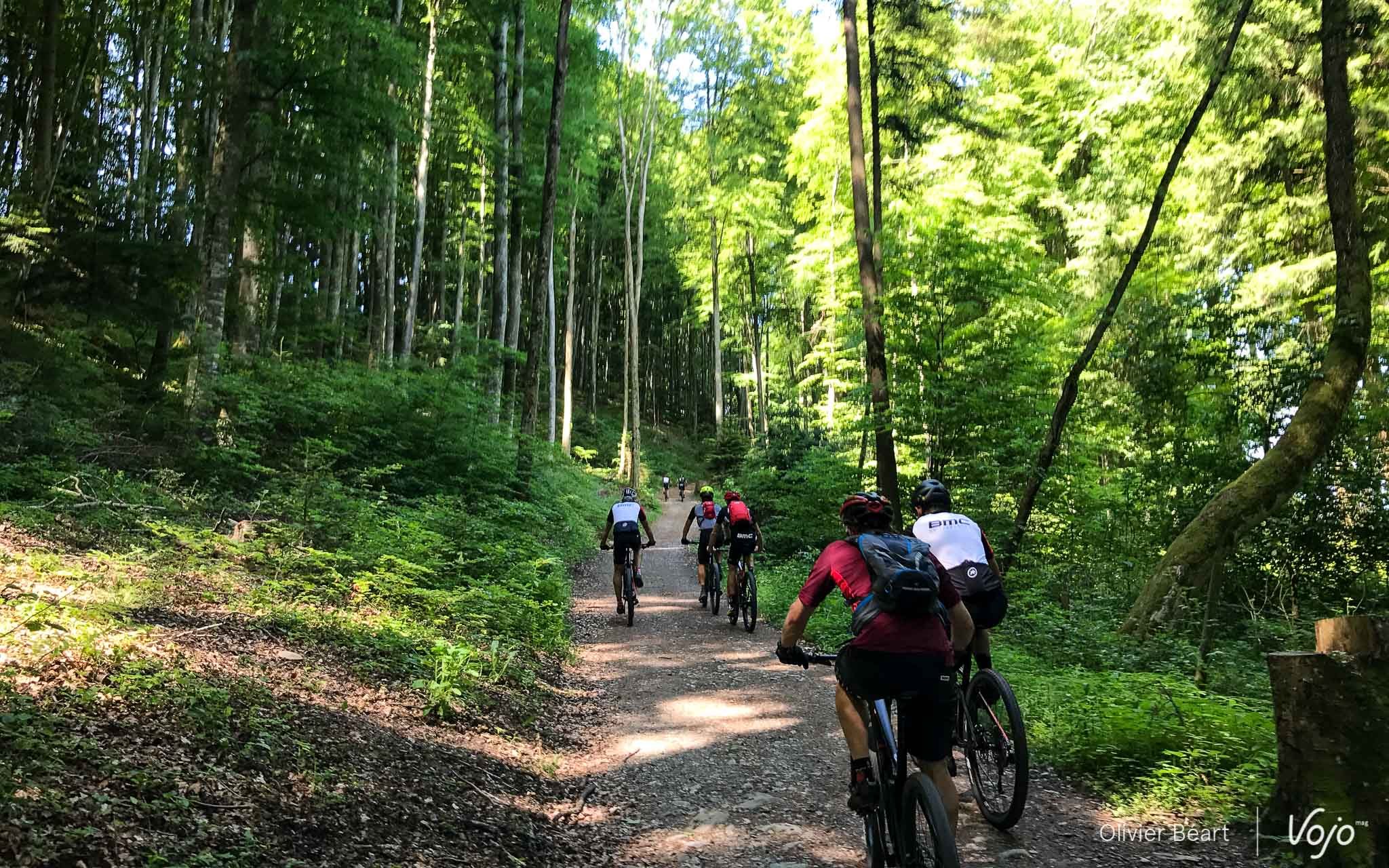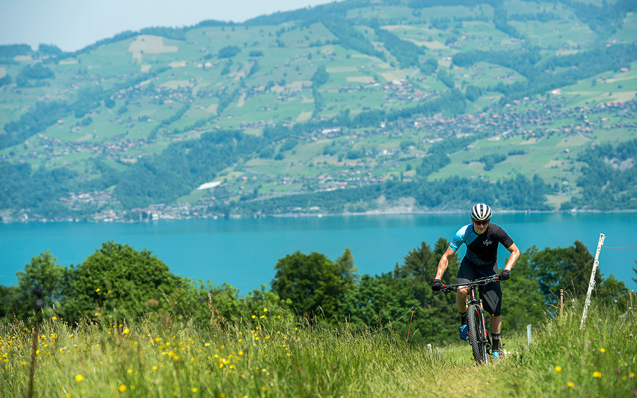 A la sortie de la gare de Spiez, une belle petite flotte de vélos nous attend pour une première prise en mains dans les bois en Alpages qui bordent le magnifique lac.
