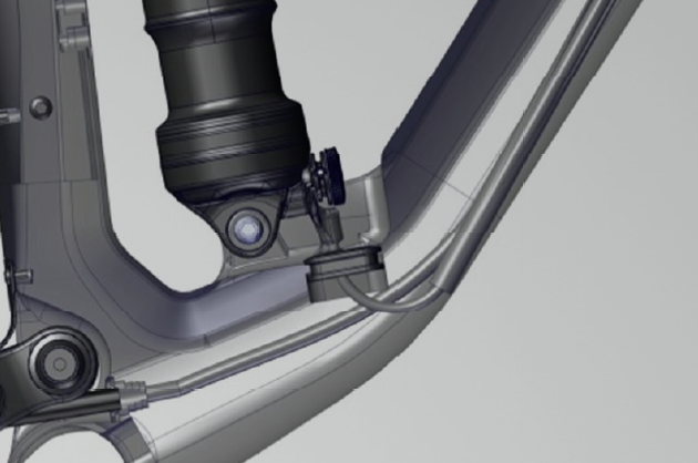 Le passage du câble de commande du blocage de l’amortisseur se fait entièrement en interne, et la fameuse biellette inférieure intègre aussi désormais le passage interne de la gaine de dérailleur arrière ainsi que de la Durit de frein. De quoi éviter une sortie disgracieuse et une forte exposition aux pierres sous le boîtier de pédalier. Encore une fois, chapeau, c’est beau et c’est malin.