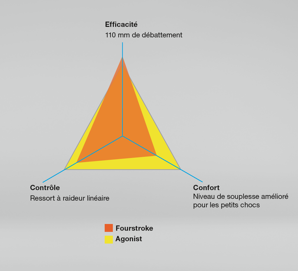 Bref, il doit être le compagnon de ride idéal et son nom, Agonist, il le doit au muscle « dont l’action produit le mouvement désiré, par opposition à antagoniste« , nous apprend notre ami Wikipedia. Quant au Fourstroke, « il va de plus en plus se tourner vers le XC avec uniquement des cadres full carbone, plus de montages en double,… » nous dit-on, histoire que chacun ait bien son pré-carré dans le catalogue.