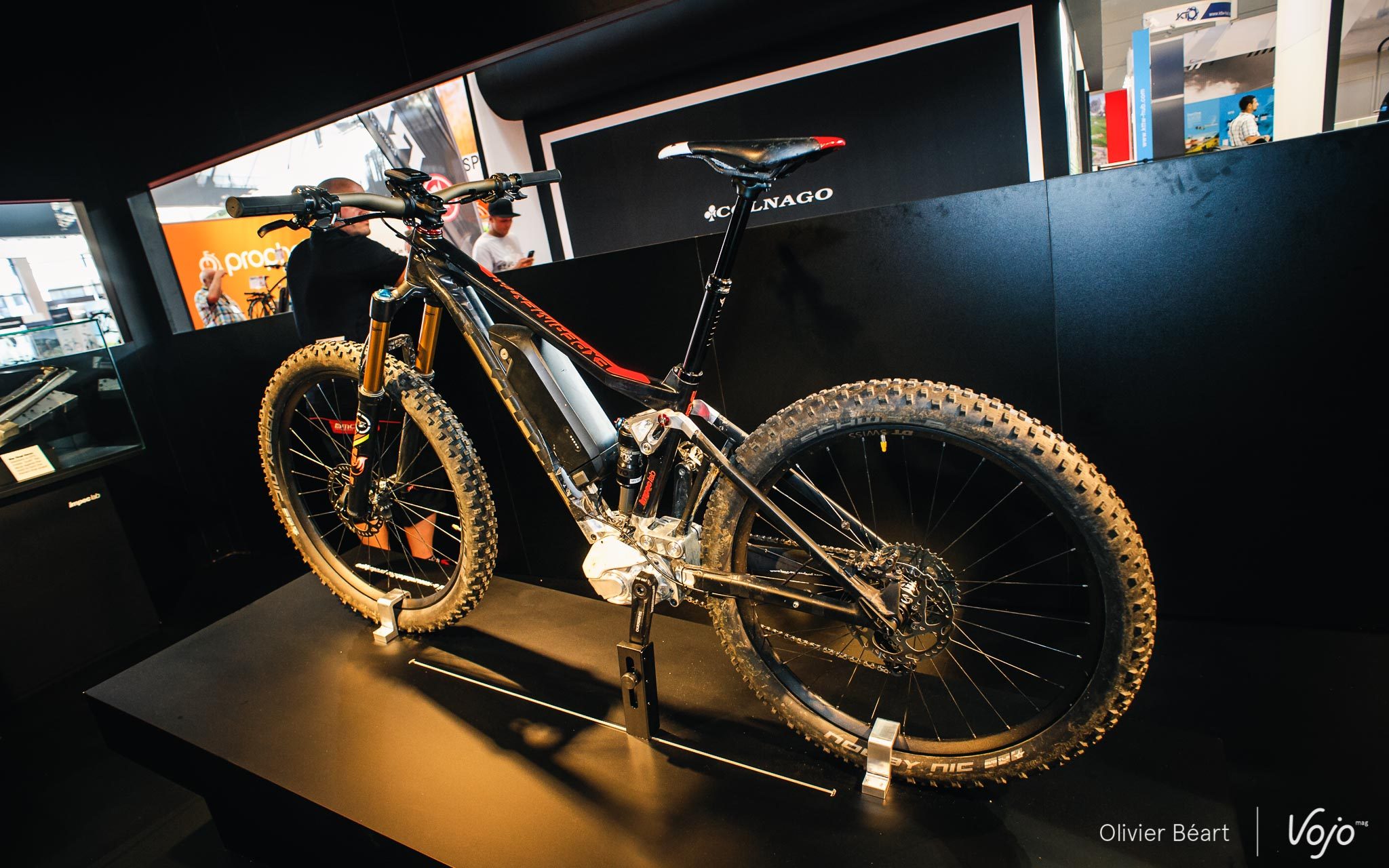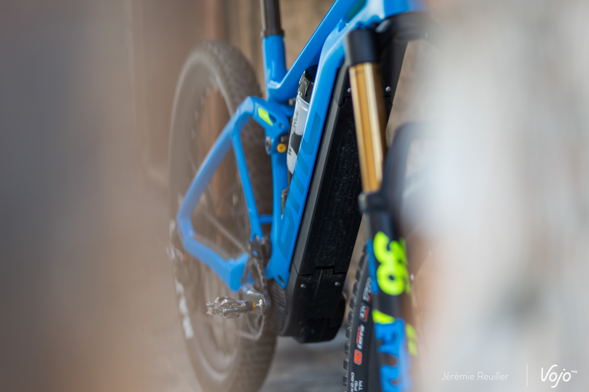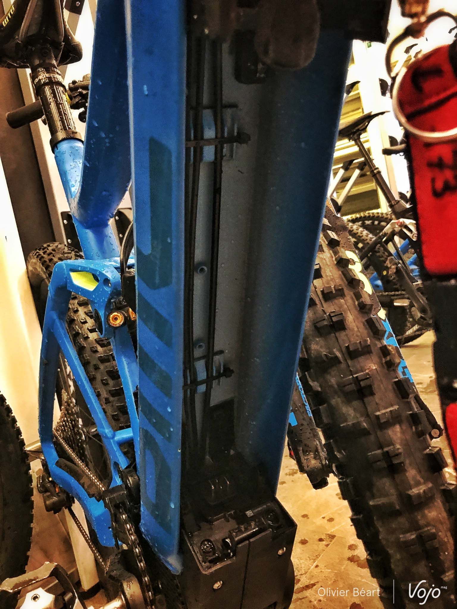 Ce dernier est toujours noir, alors que le cadre est coloré afin d’alléger l’ensemble visuellement (les protos noirs roulés par les membres de l’équipe sont effectivement bien plus massifs visuellement). Petit détail important : on peut aussi monter un porte-bidon sur ce vélo grâce à l’intégration de la batterie.