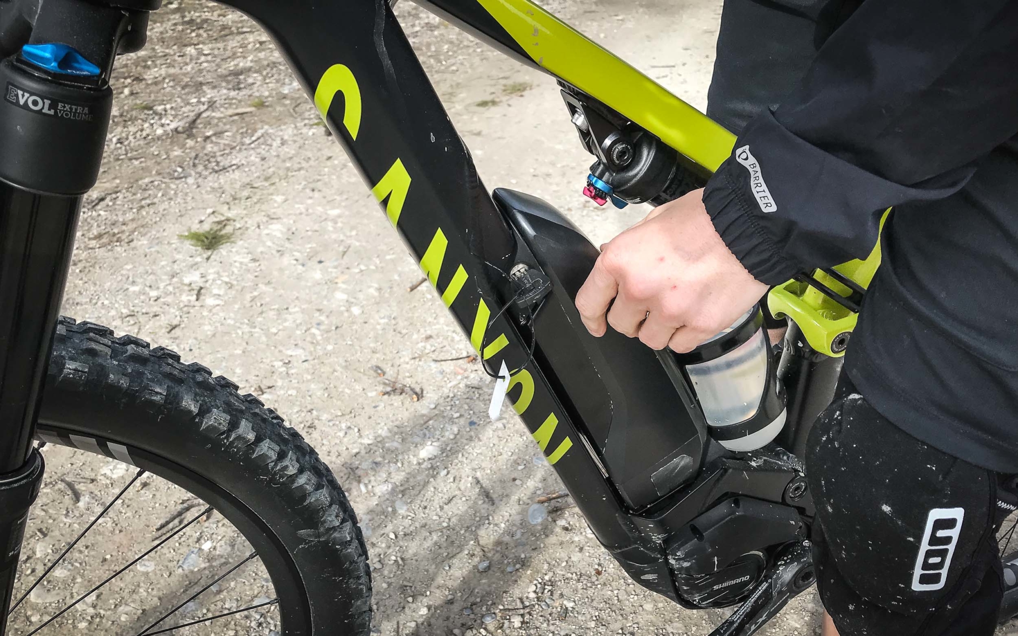 Petit détail non négligeable sur le terrain : malgré la batterie non intégrée, le Canyon Spectral:ON accepte un porte-bidon et une bouteille compacte. « On pense qu’on va s’adresser à des rouleurs avec ce vélo, des gens qui aiment partir à l’aventure, explorer. Alors, dans ce cadre, le porte-bidon est indispensable, » martèle Daniel Oster, le « papa » du Spectral:ON. Un carter spécifique protège aussi le bas du moteur et un guide-chaîne intégré prend place au niveau du pédalier.