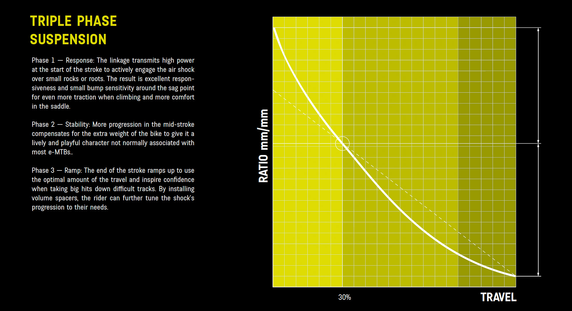 La courbe de la suspension arrière a été travaillée par Canyon de sorte à offrir des performances adaptées au poids de l’électrique (21,55kg annoncés pour le Spectral:ON). Le début de course est sensible pour le confort et la traction, mais il y a nettement plus de progressivité ensuite pour assurer un bon maintien, et la fin de courbe est nettement plus raide pour éviter de talonner. La suspension a aussi pour but de rester bien active au freinage. L’amortisseur accepte aussi des volume spacers.
