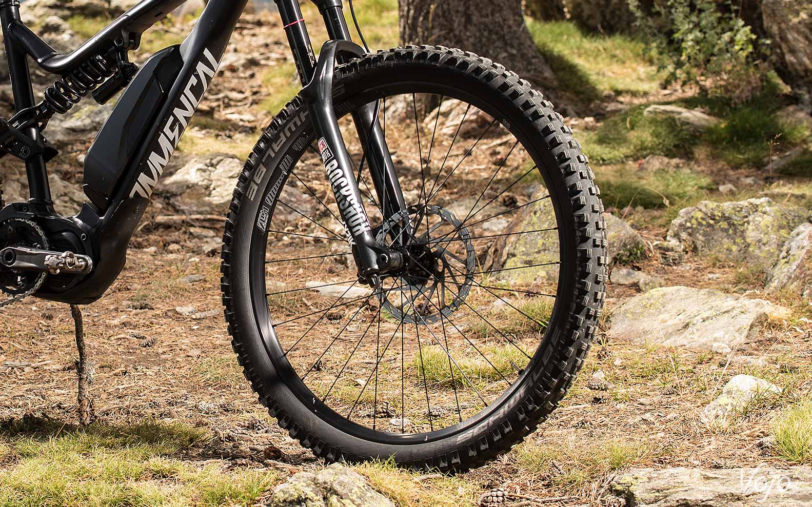 Du côté des roues et des pneus, le Commencal Meta Power est assez logiquement surdimensionné. Mais pas tant que cela finalement car les développeurs ont effectué pas mal de tests et, pour garder un comportement plus précis, proche du Meta classique, c’est vers des jantes en 35mm de large (WTB ou Spank Oozy Trail) que Commencal s’est tourné ; le tout couplé à des pneus en 2.6 de largeur même si du 2.8 passe aussi sans souci si l’acheteur préfère. Au catalogue, ce sont des Maxxis en carcasse Exo devant et Double Down derrière pour vraiment pouvoir attaquer, mais sur notre vélo de test nous avons eu droit à des Schwalbe Nobby Nic et Magic Mary vraiment intéressants aussi et qui pourraient d’ailleurs par la suite faire leur entrée dans la gamme.