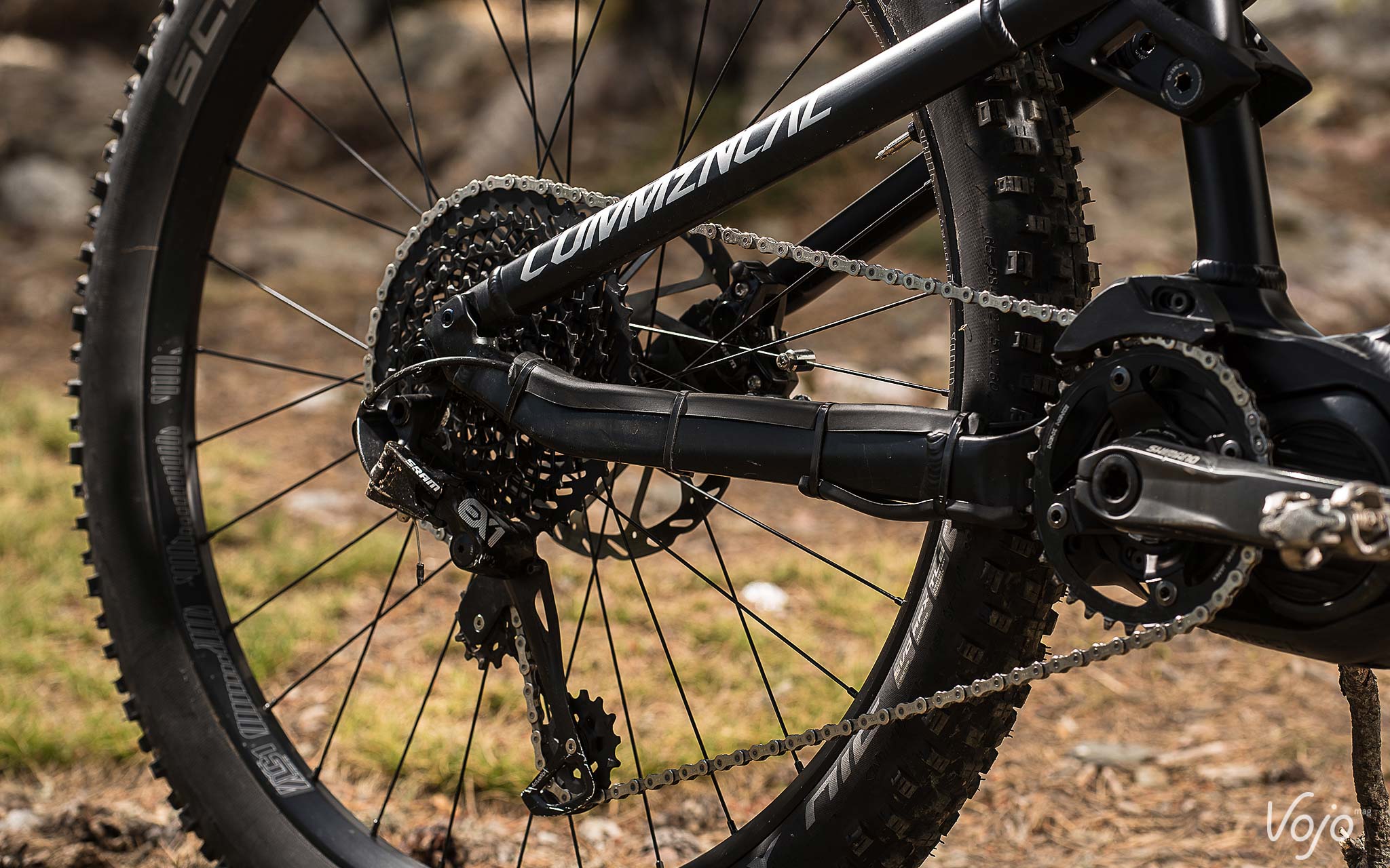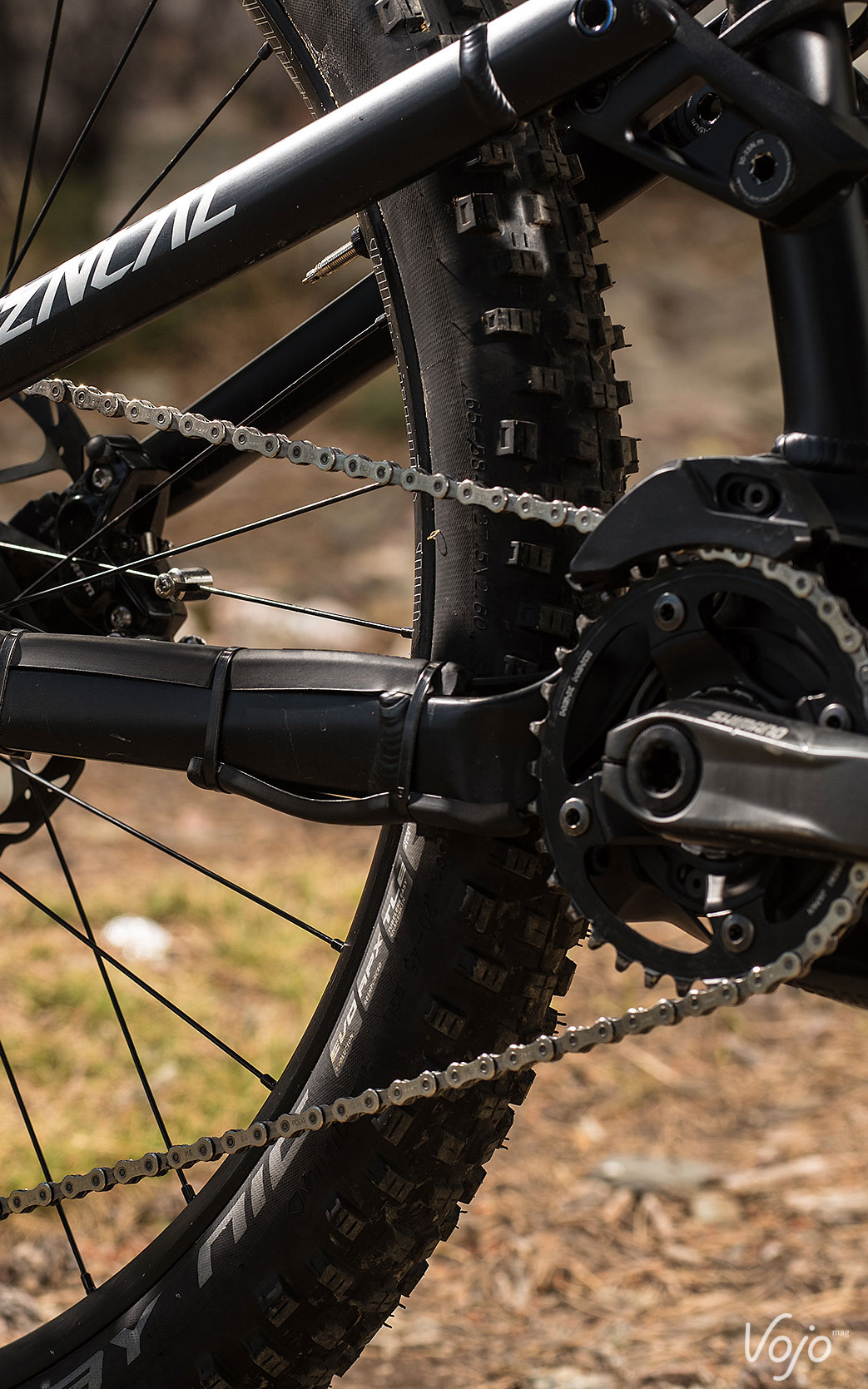 Un des avantages du moteur Shimano, c’est sa compacité. De sorte que Commencal, tout en optant pour une monte en pneus de 2.6 (nous y reviendrons), a réussi à garder des bases très courtes : 444mm, soit seulement 7mm de plus que le Meta AM V4.2. Un très, très joli score pour un vélo électrique.