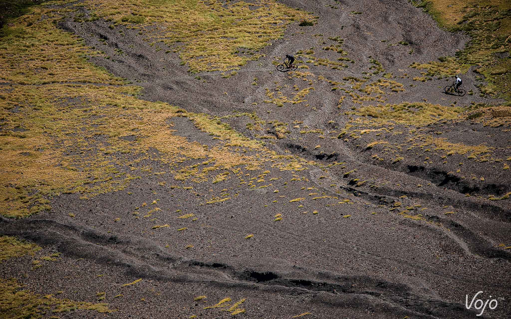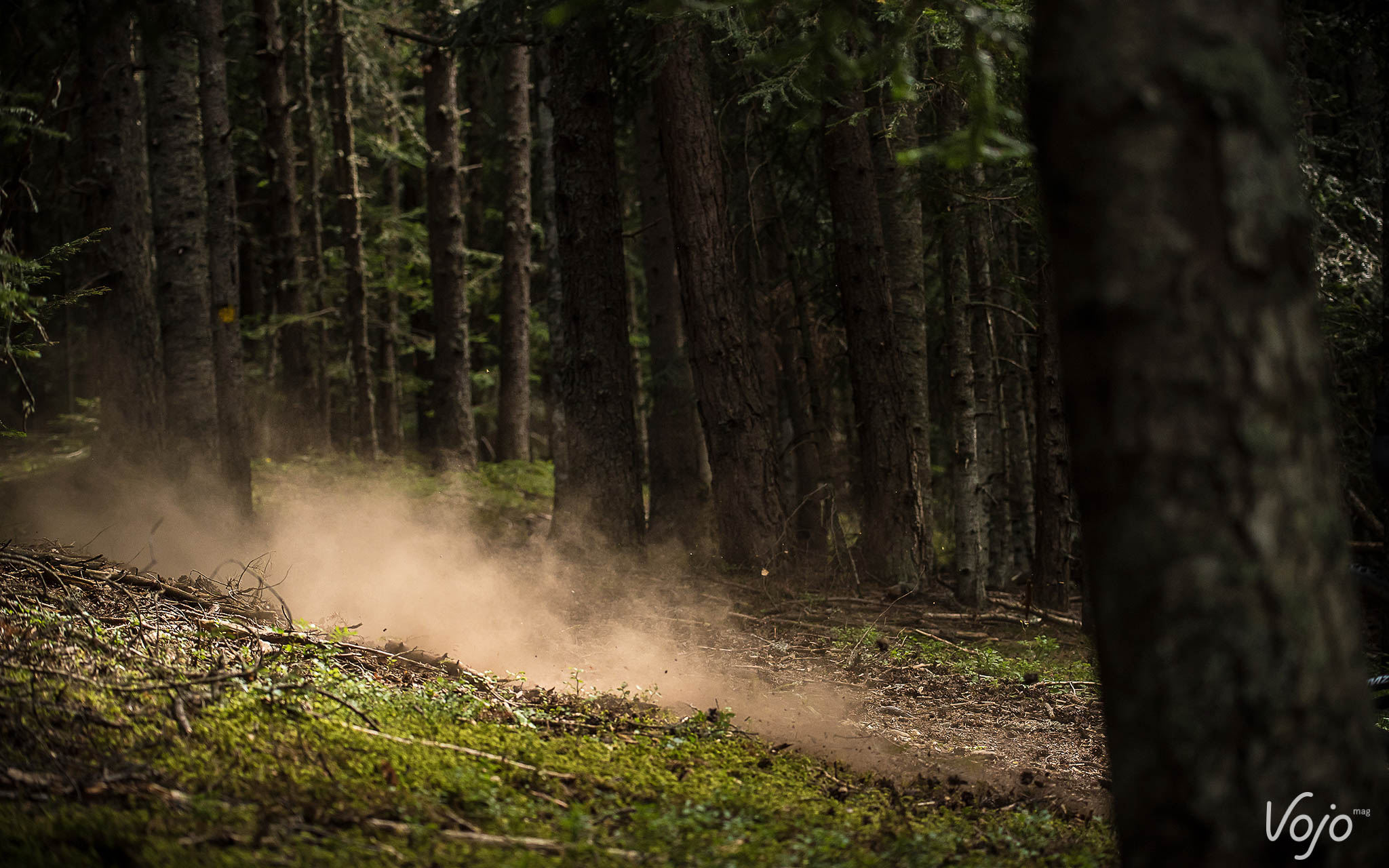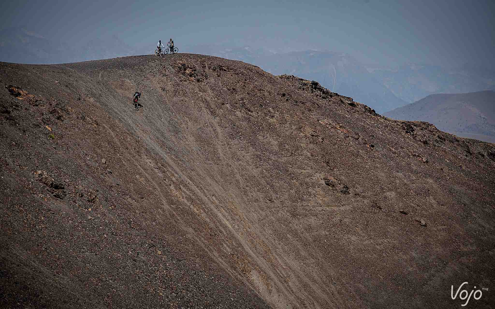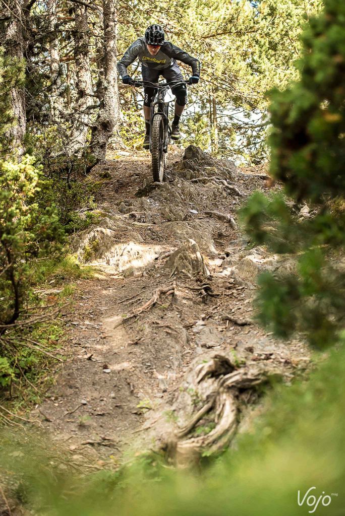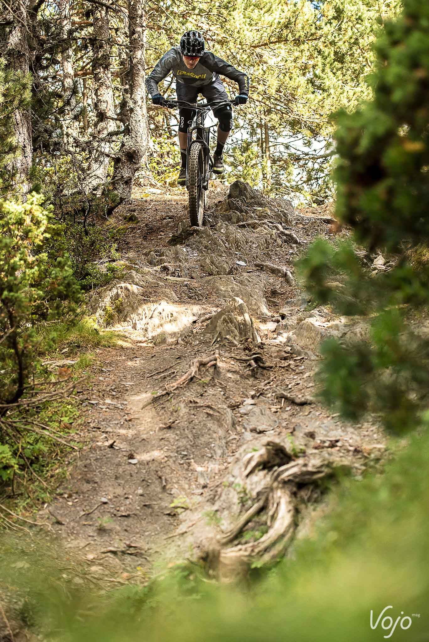 Bon, maintenant qu’on est au sommet des montagnes, il est temps d’enfiler les protecs et de se retrousser les manches pour retourner dans la vallée. Au menu pour commencer… une impressionnante dégringolade droit dans la pente. Au-dessus, on stresse un peu en voyant la chose mais une fois qu’on est dedans, on garde sans aucun mal le contrôle du vélo et on n’a pas du tout l’impression d’être aux commandes d’un 38 tonnes qui tire tout droit et qui va avoir besoin de la voie de détresse pour s’arrêter. Ouf !
