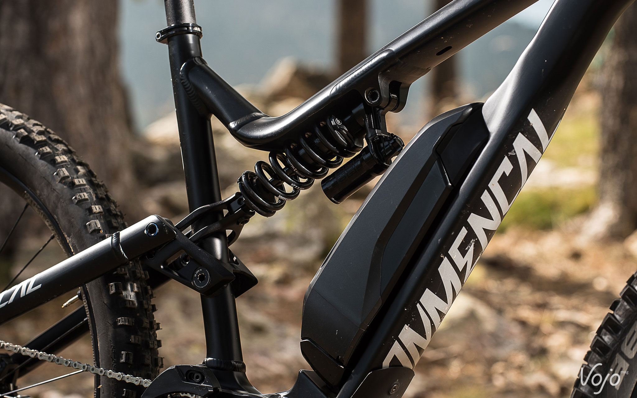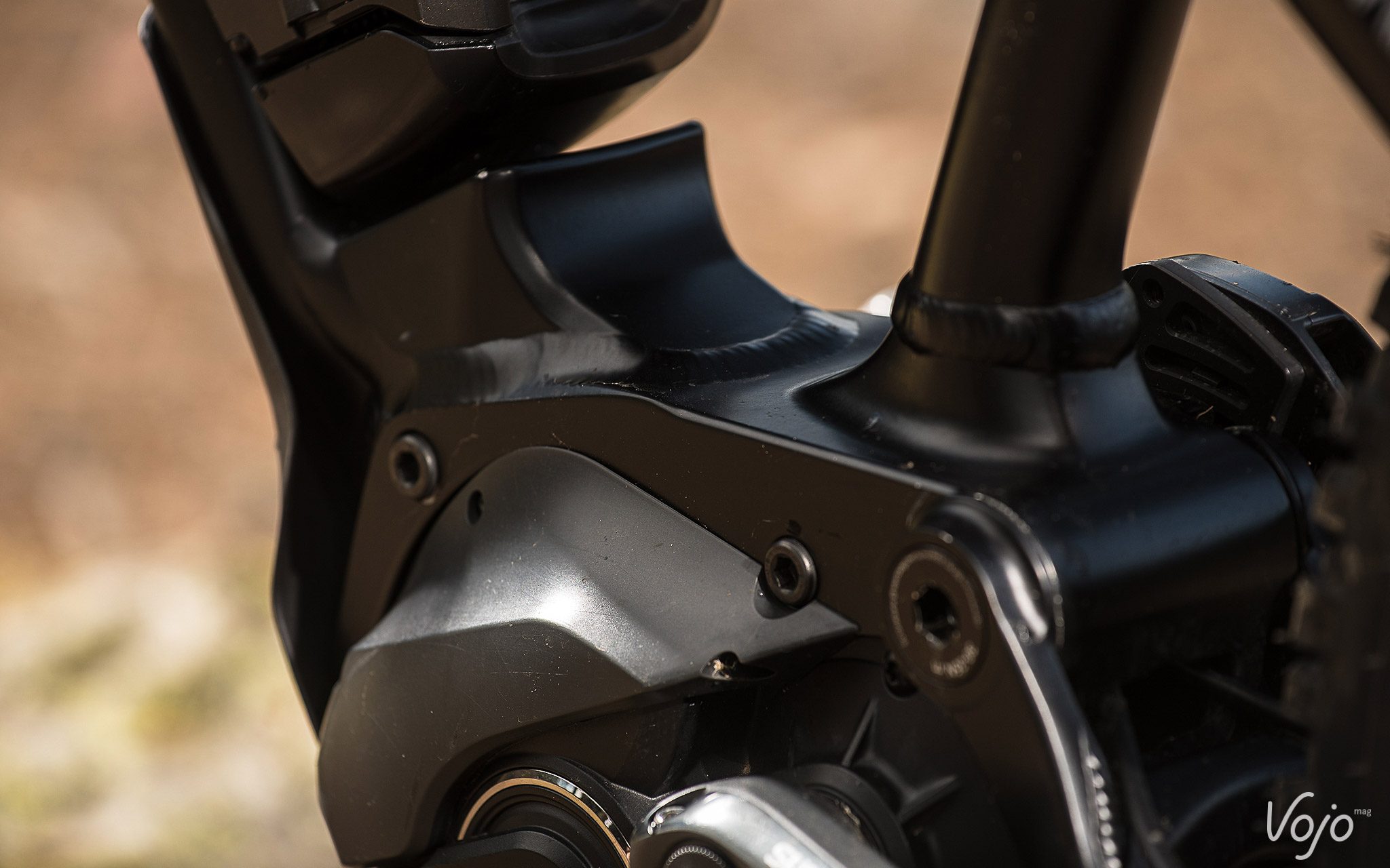 Partant de là, l’ingénieur responsable du projet, Nicolas Menard, et le designer avec qui il travaille en tandem, Thomas Moret, ont travaillé quelques petits détails sur le cadre pour faire en sorte que la batterie classique soit la plus discrète possible, avec la présence de deux petits renforts soudés (car oui, bien entendu, s’agissant d’un Commencal, le cadre est bien évidemment en aluminium). Au niveau du renfort supérieur, la soudure est même polie afin d’éviter toute cassure visuelle.