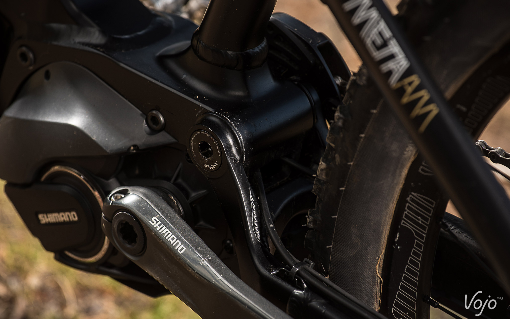 Par contre, on remarque que la fixation est beaucoup plus large, et nous verrons un peu plus tard que cela a un impact très positif sur la rigidité du triangle arrière. Pour rappel, dans notre test du Meta AM V4.2, nous avions souligné que le vélo nous a paru très souple. Parfois trop. On attendait donc le Meta Power et ses 22kg au tournant ! Nous pensions que cela provenait des biellettes près de l’amortisseur, mais il semble qu’en fait c’est plutôt près du boîtier de pédalier que cela se joue.