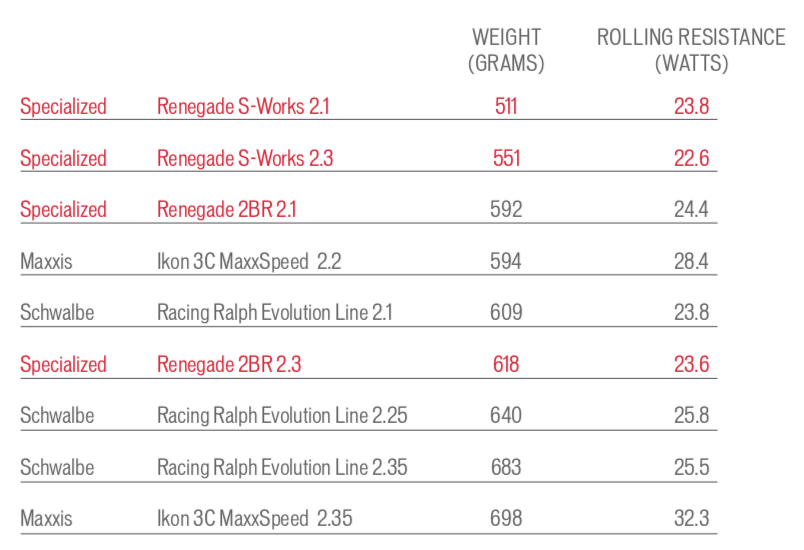 Lors de la présentation, Specialized affichait fièrement les mesures de résistance au roulement de son modèle le plus rapide, le Renegade. On le voit, il devance ses principaux concurrents de chez Schwalbe et Maxxis (tous les pneus sont testés à 2 bars avec une chambre à air Maxxis). Le gain est faible par rapport à la version classique (de l’ordre d’1W à section égale), mais il est là.