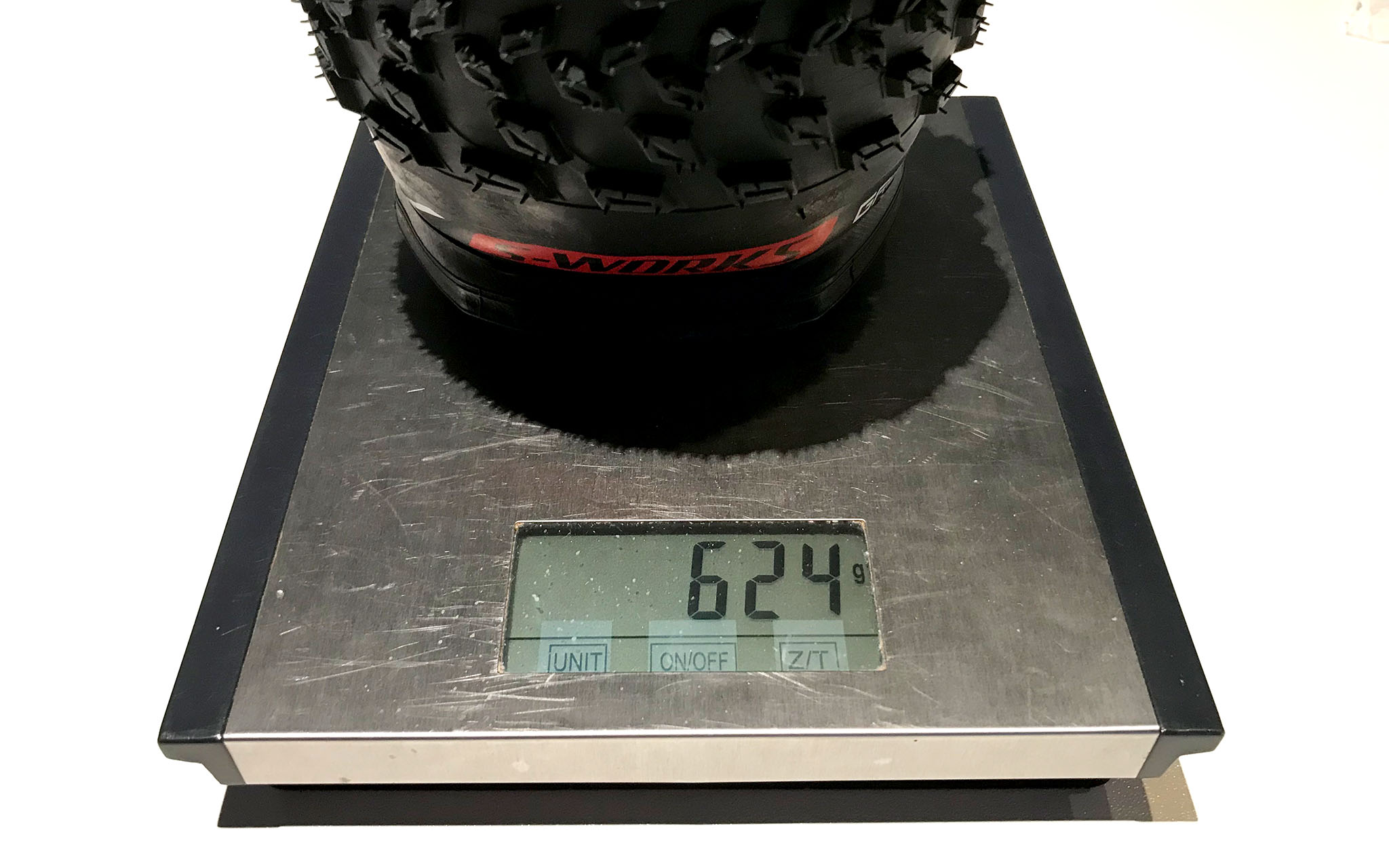Avant de monter les pneus Specialized Fast Trak S-Works en section 2.3 sur deux de nos vélos de test, ils ont fait un petit tour sur la balance. Sur deux paires, nous avons enregistré des poids entre 605 et 624g (l’image ci-dessus étant celle du pneu le plus lourd), avec une moyenne de 614g. C’est plus que ce que Specialized annonce, et on est loin des poids record de la précédente génération de pneus S-Works (dont certains descendaient sous les 550g), mais cela reste un très joli score pour des pneus de 2.3″ de section. C’est aussi quasiment 100g de moins que la version Grid. Toujours au niveau des mesures, nous avons mesuré la largeur entre crampons à 58mm sur une jante de 24mm, soit 2,28″. La promesse d’une section 2.3 est donc (presque) tenue.