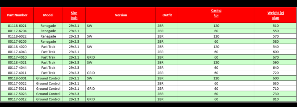 Voici la liste de toutes les versions disponibles pour les pneus Specialized dédiés au XC, avec le Renegade (le plus rapide, pour terrains secs), le Fast Trak (très rapide aussi mais un poil plus polyvalent) et enfin le Ground Control (plus cramponné, adapté à la boue ou aux terrains plus exigeants).