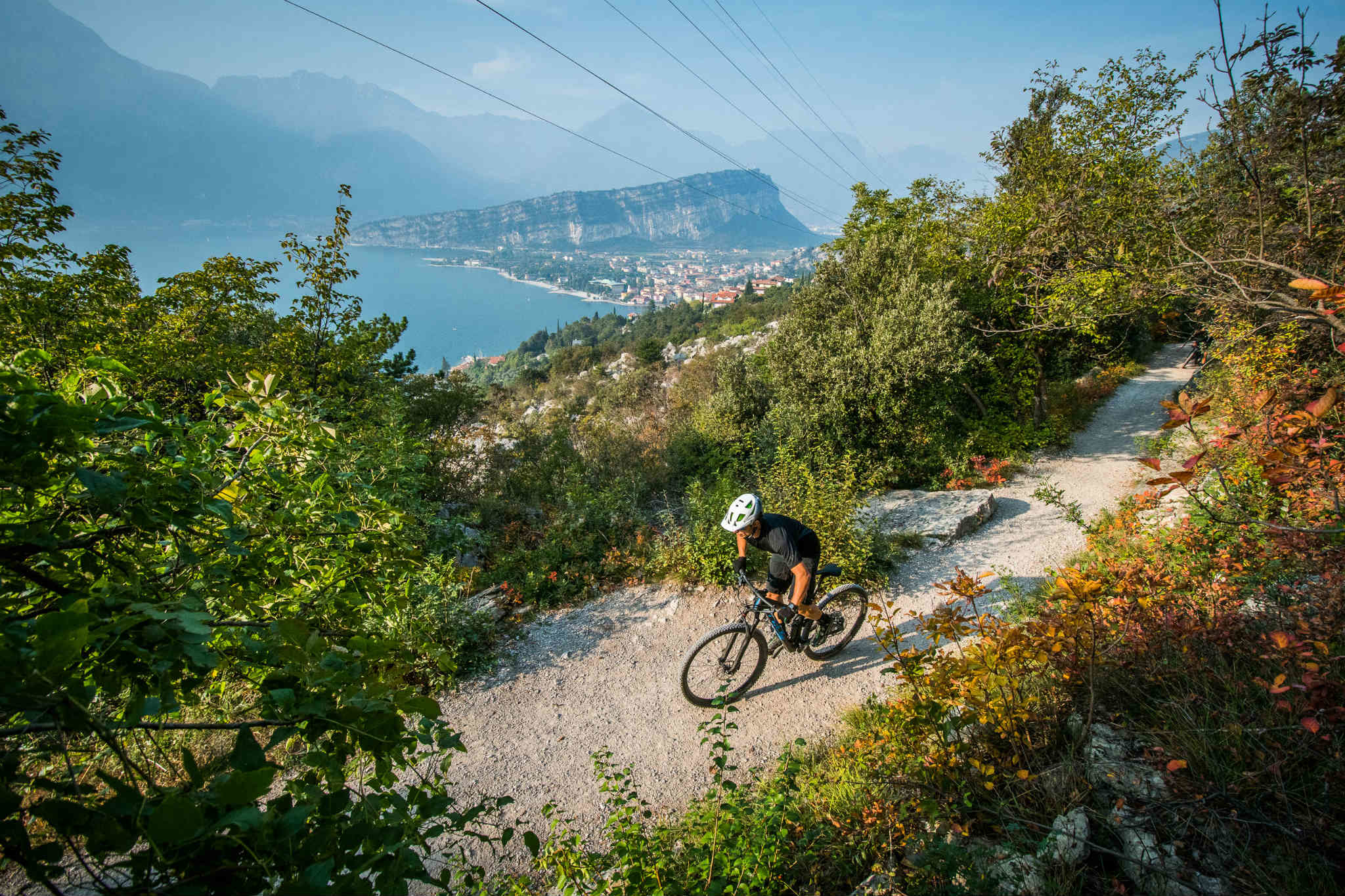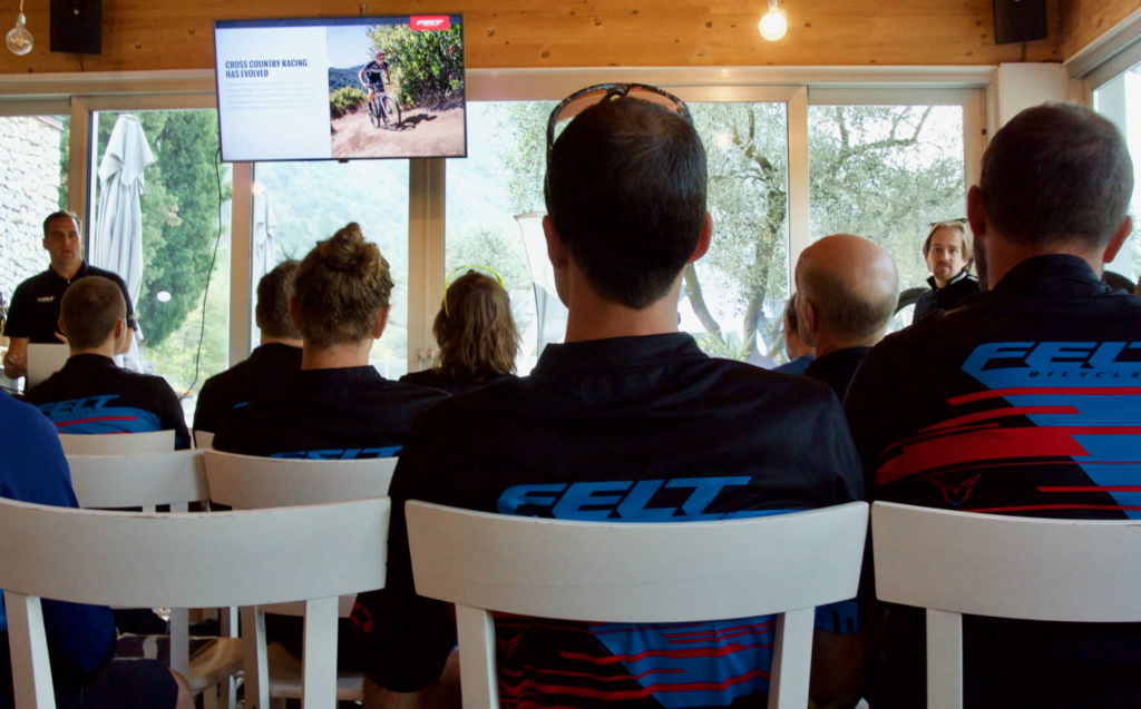 Ceux qui sont familiarisés au terrain et aux trails autour de Torbole savent qu’ils ne sont pas des plus simples. Les montées sont raides, alors que la surface est un fameux mélange de rochers et de cailloux. Felt avait tracé trois boucles pour l’occasion, dépendant du type de vélo. Plus tôt dans la journée, nous roulions sur le nouveau semi-rigide, le Doctrine (nous vous en reparlerons). La boucle pour le Doctrine était un parcours-type du cross-country moderne : une côte raide, une descente rapide suivie d’une nouvelle côte raide et d’une descente rocailleuse brutale.