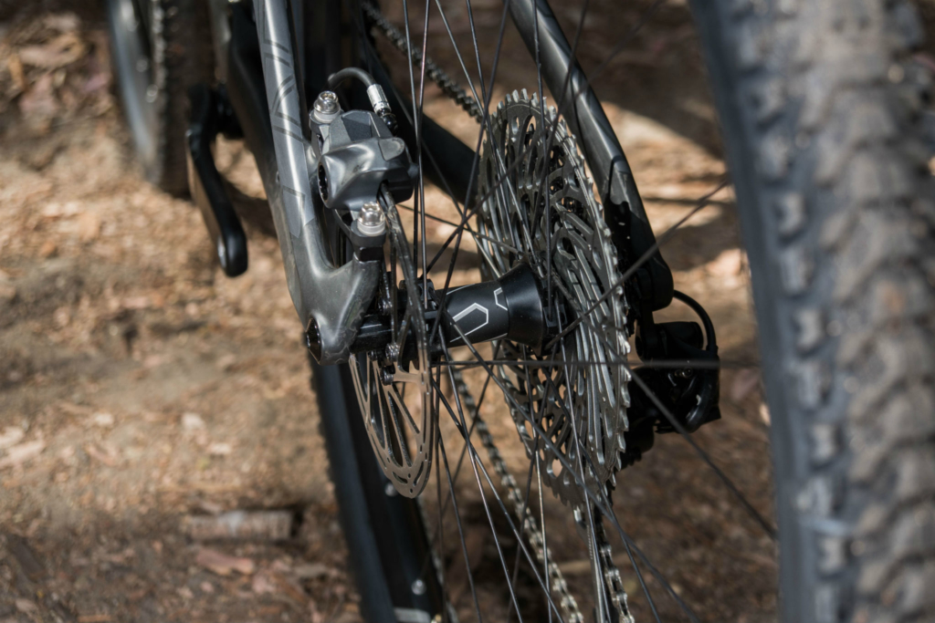 La forme du cadre offre la possibilité d’utiliser une tige de selle télescopique avec un grand débattement. Au niveau de la transmission, ce n’est pas une surprise de ne voir qu’un seul plateau, vu la longue collaboration entre Felt et Sram. Depuis l’arrivée du Sram Eagle, la plupart des coureurs en cross-country et marathon utilisent le mono-plateau. Pour les plus forts, il est possible de monter un plateau jusqu’à 38 dents.