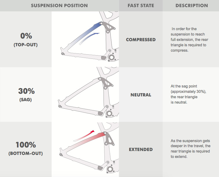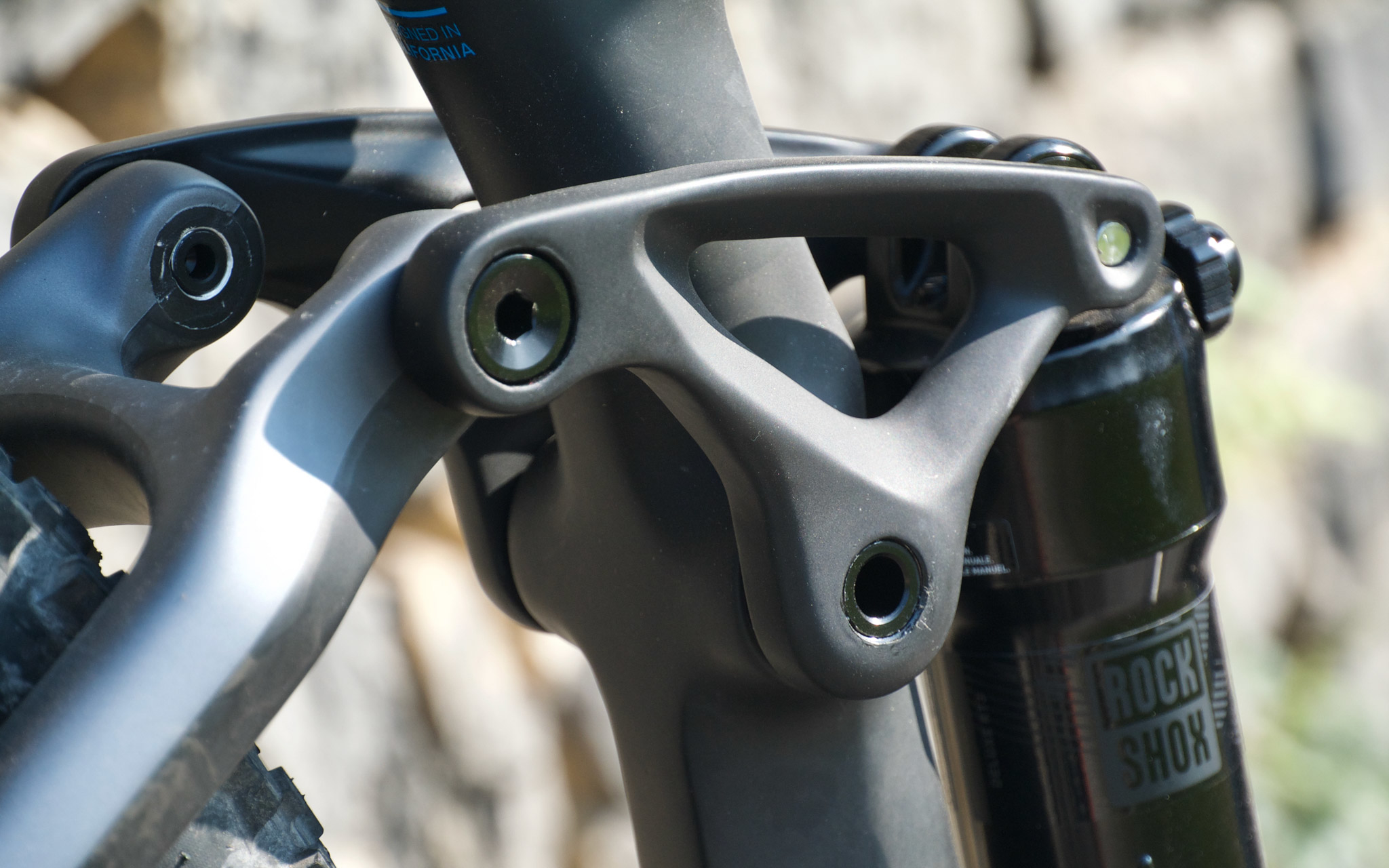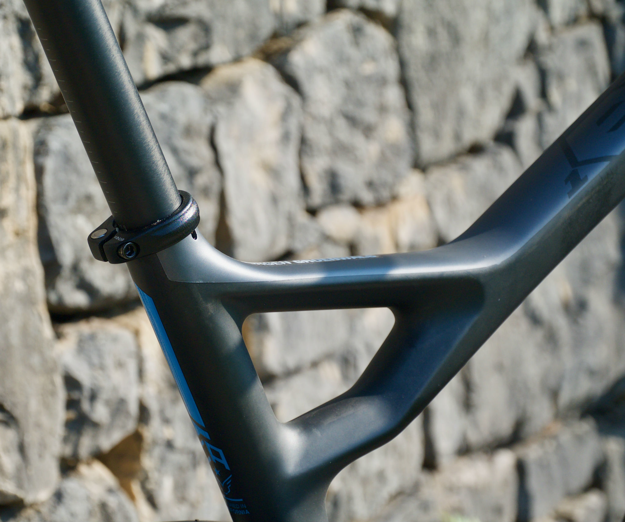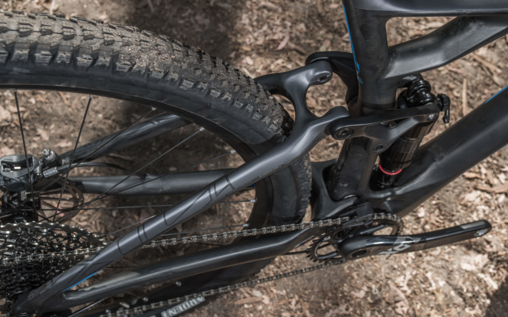 Pour faire simple, le triangle arrière permet de garder l’amortissement stable au sag, et pour y parvenir, il est moulé de sorte que les fibres soient en position neutre à 30% de compression de la suspension. Si l’amortisseur est en extension complète, les fibres de carbone vont se compresser et aider à offrir plus de sensibilité sur les petits chocs. Si l’amortisseur est enfoncé complètement, les fibres travaillent en extension et offrent plus de résistance pour éviter de « taper au fond ». Enfin, le triangle arrière est fait d’une seule pièce, ce qui permet de limiter le poids et l’entretien.