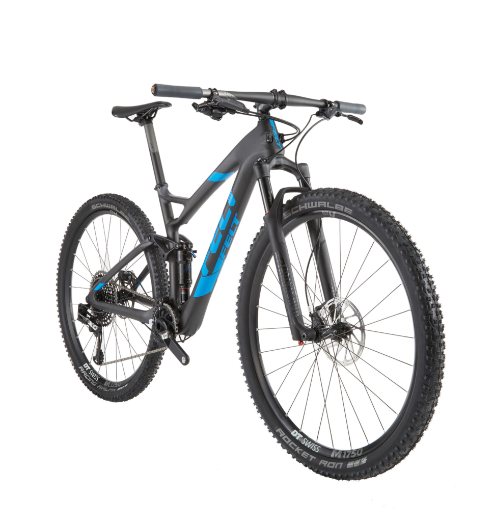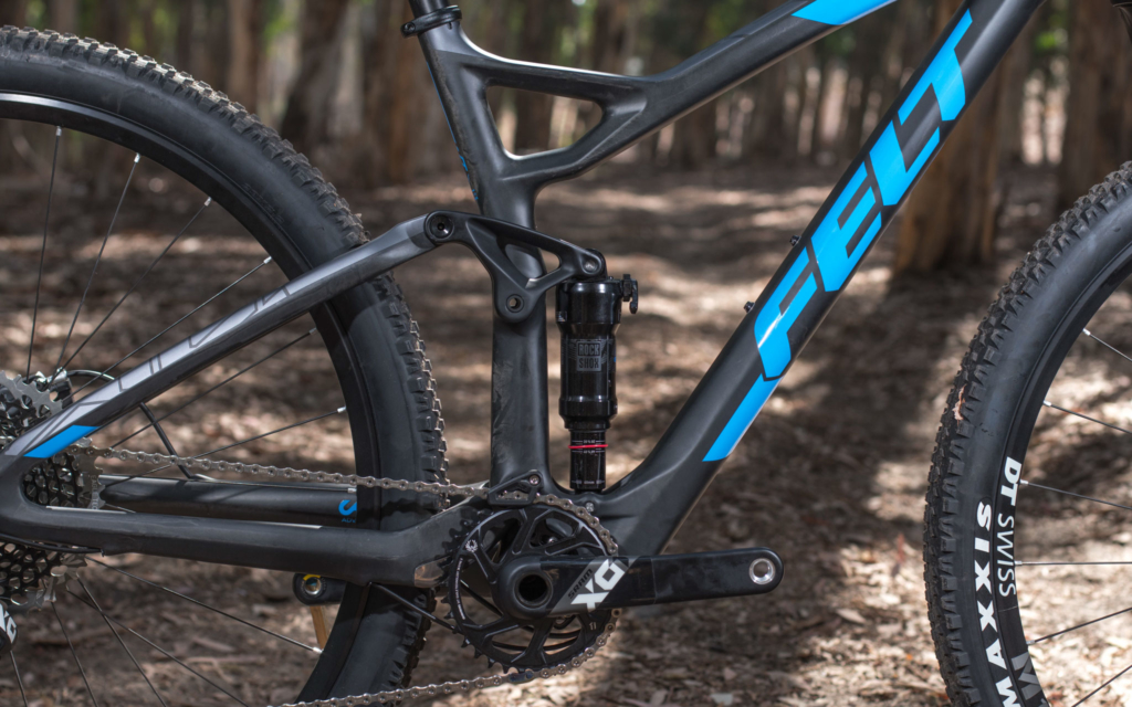 La forme du cadre offre la possibilité d’utiliser une tige de selle télescopique avec un grand débattement. Au niveau de la transmission, ce n’est pas une surprise de ne voir qu’un seul plateau, vu la longue collaboration entre Felt et Sram. Depuis l’arrivée du Sram Eagle, la plupart des coureurs en cross-country et marathon utilisent le mono-plateau. Pour les plus forts, il est possible de monter un plateau jusqu’à 38 dents.