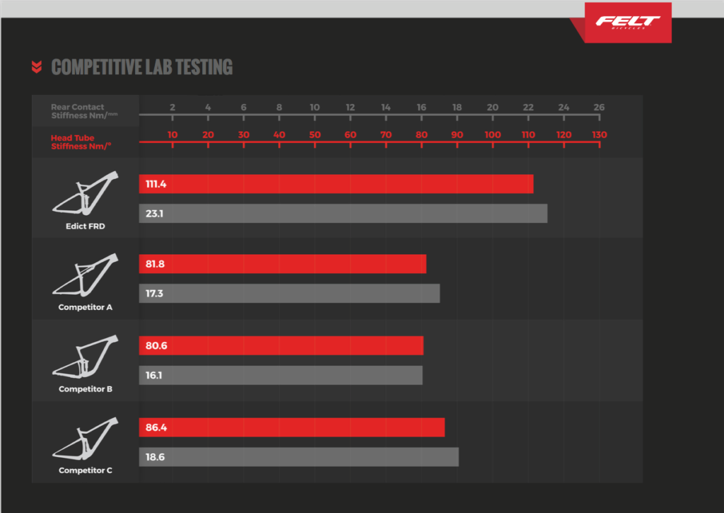 Felt a une longue expérience dans la production de cadres en carbone, un matériau qu’ils ont été parmi les premiers à adopter dans le VTT. Leurs vélos de piste, chrono et de triathlon sont très avancés au niveau de leur forme et des techniques de construction. Parmi ces cadres, les initiales FRD – pour Felt Racing Development – représentent le fin du fin. Dans le cas présent, ils utilisent une fibre de carbone Textreme conçue par les suédois d’Oxeon. Cette fibre est utilisée notamment dans l’industrie aérospatiale où le Spread Tow breveté est constitué de plaques de carbone au lieu de fils. Plus de carbone et moins de résine mène à une combinaison plus légère et plus rigide.