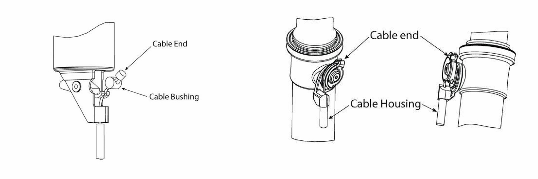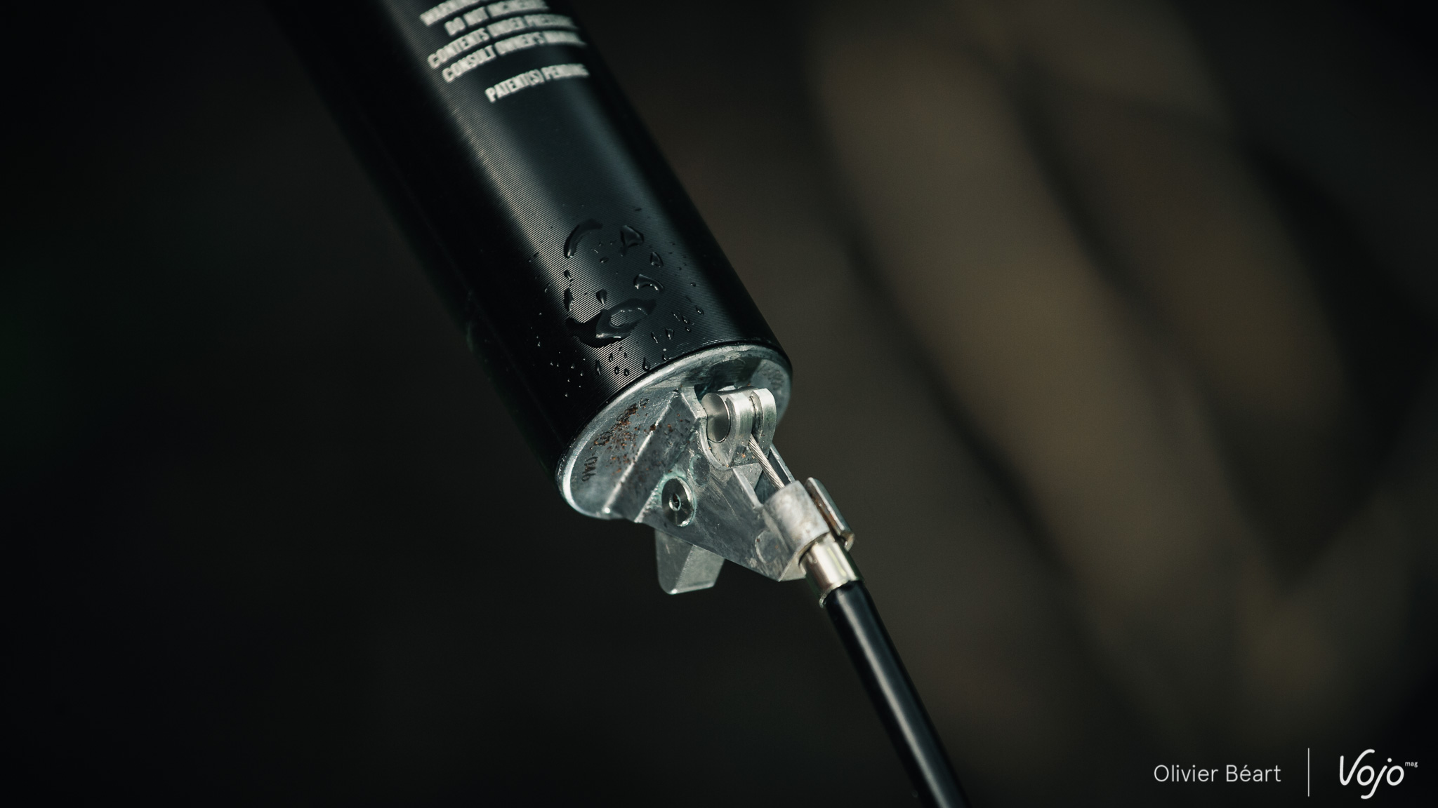 Dans ce dernier cas de figure, l’accroche du câble se fait au niveau du collier de selle et plus sur le haut, ce qui évite de faire varier la longueur du câble quand on abaisse ou remonte la selle comme sur la Doss. Attention toutefois pour ceux qui ont peu de sortie de selle, l’option passage externe limite l’enfoncement de la tige dans le cadre de quelques millimètres.